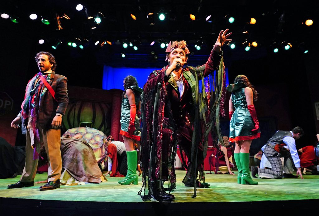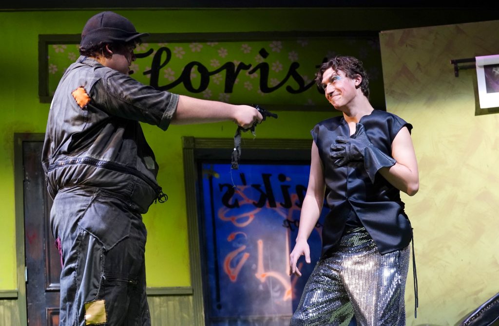 Orin (Carter Giannetti) approaches one of the winos in the alley outside the flower shop during a dress rehearsal for the theatre department’s production of “Little Shop of Horrors” at Ethington Theatre on Nov. 5, 2025. -