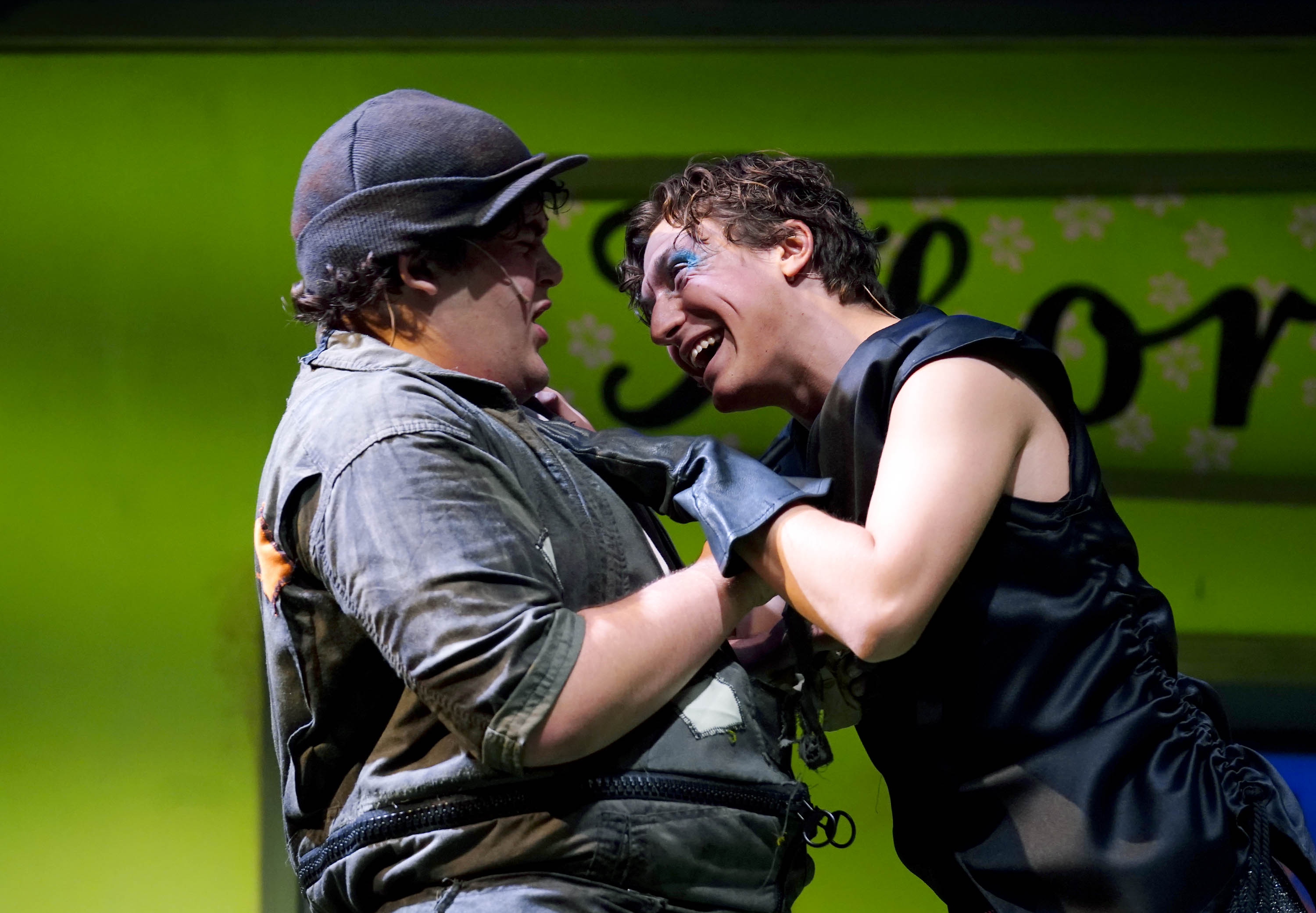 Seymour (Erick Resendiz, left) confronts Orin (Carter Giannetti) during a dress rehearsal for the theatre department’s production of “Little Shop of Horrors” at Ethington Theatre on Nov. 5, 2025. -