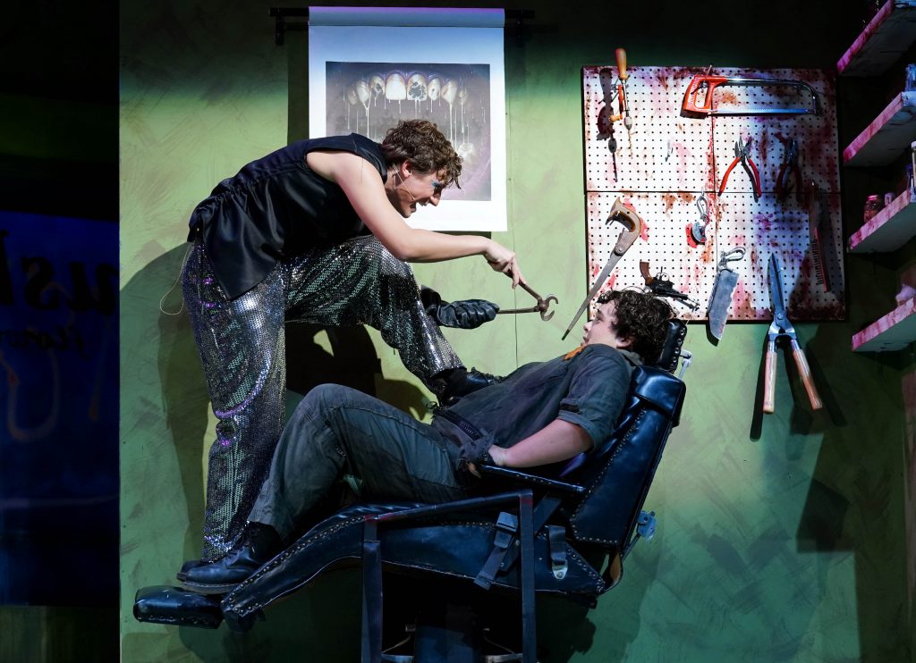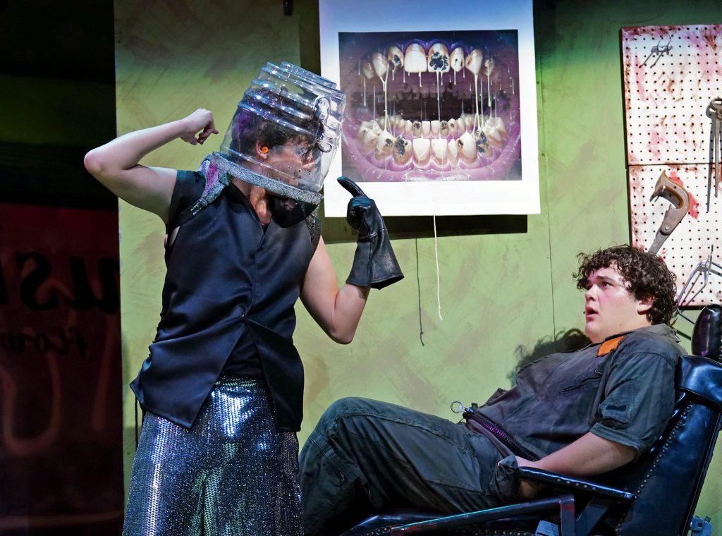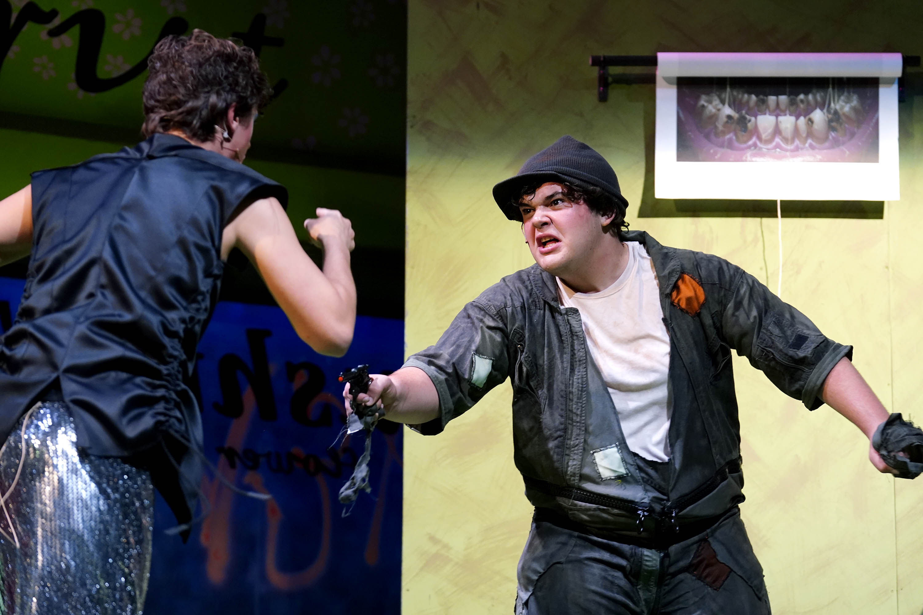 Orin (Carter Giannetti, right) notices that Seymour (Erick Resendiz) needs some dental work during a dress rehearsal for the theatre department’s production of “Little Shop of Horrors” at Ethington Theatre on Nov. 5, 2025. -