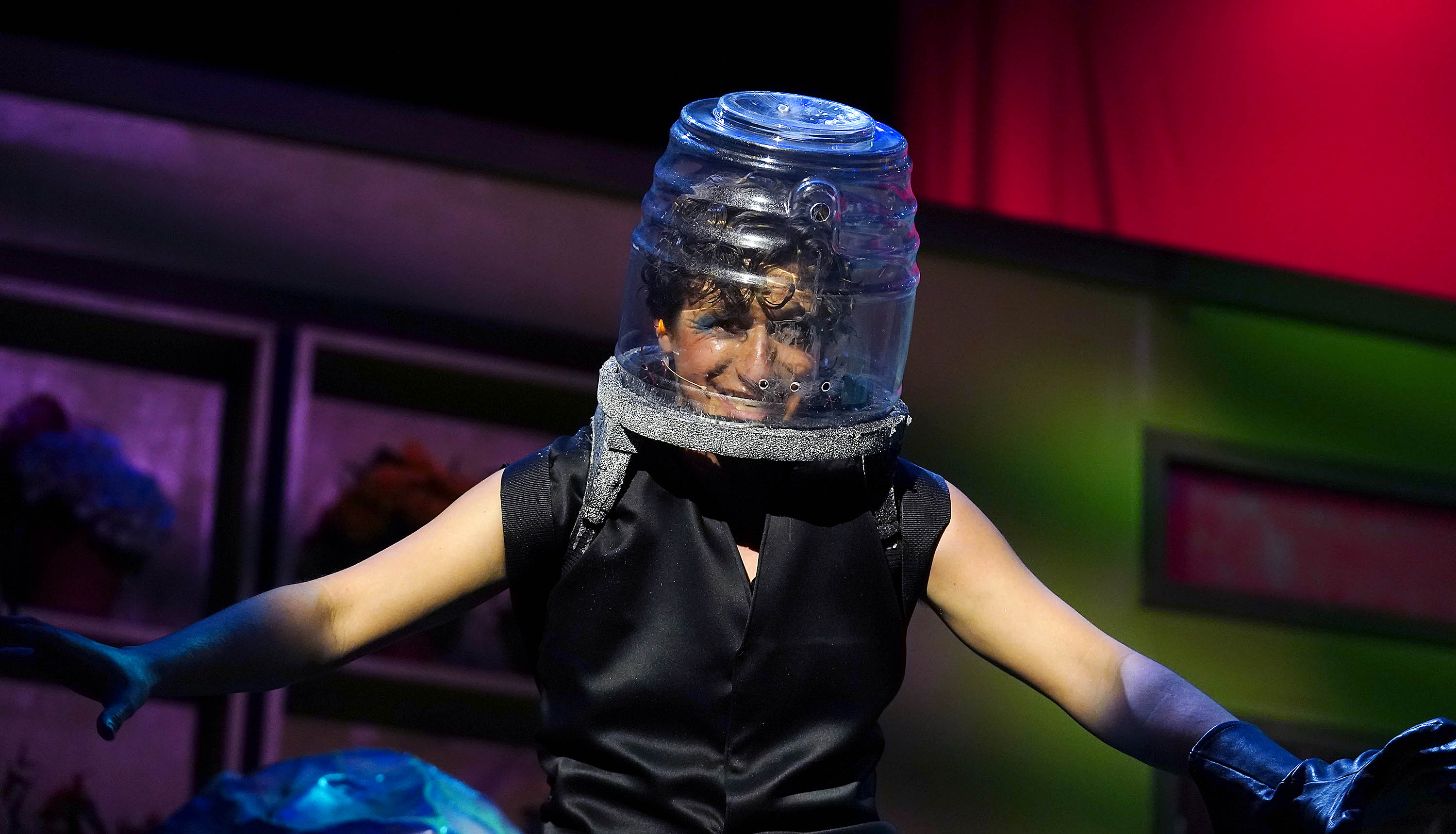 Orin (Carter Giannetti) realizes his nitrous oxide gas helmet is stuck during a dress rehearsal for the theatre department’s production of “Little Shop of Horrors” at Ethington Theatre on Nov. 5, 2025. -