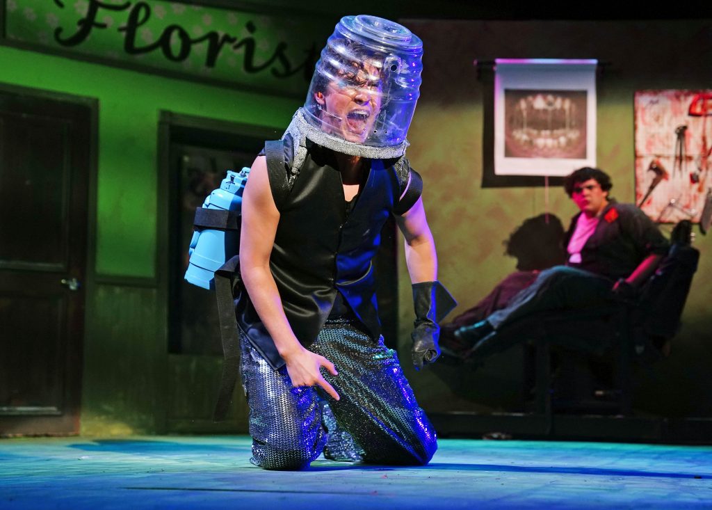 Orin (Carter Giannetti) with his nitrous oxide helmet during a dress rehearsal for the theatre department’s production of “Little Shop of Horrors” at Ethington Theatre on Nov. 5, 2025. -