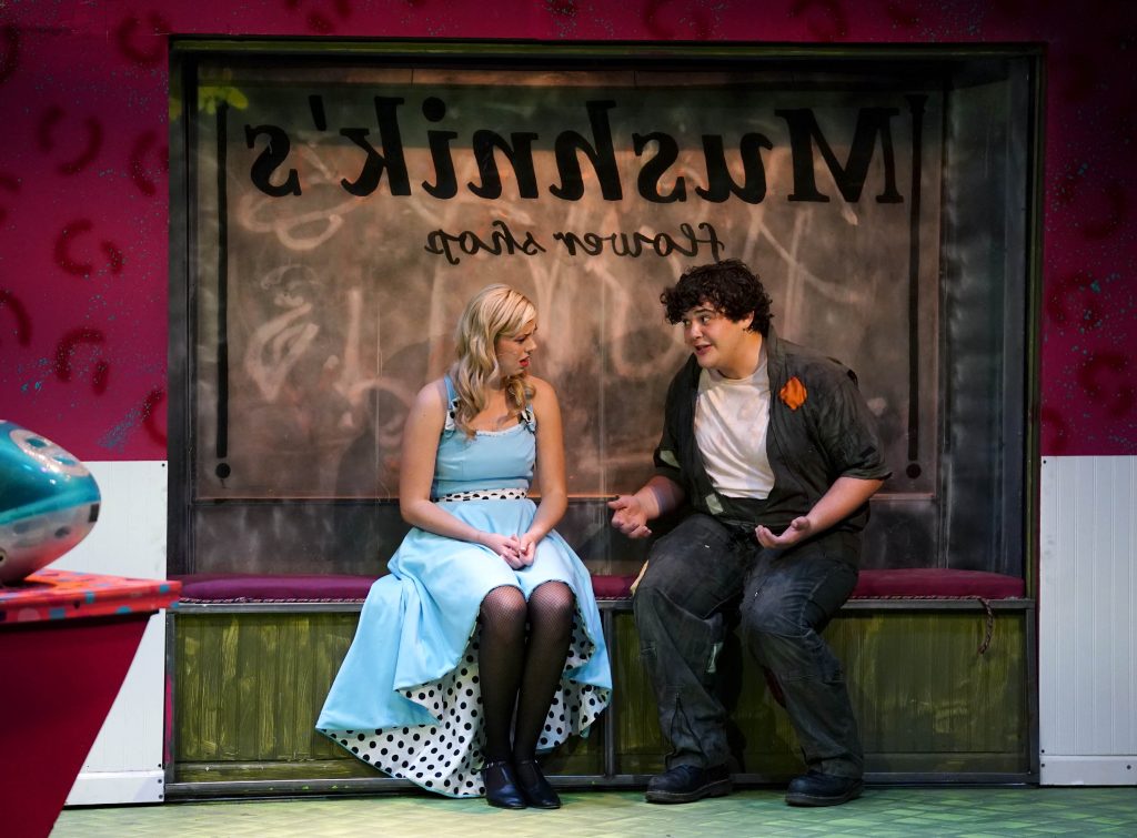 Audrey (Adeline O’Reilly) and Mr. Mushnik (Caleb Moran) during a dress rehearsal for the theatre department’s production of “Little Shop of Horrors” at Ethington Theatre on Nov. 5, 2025. -