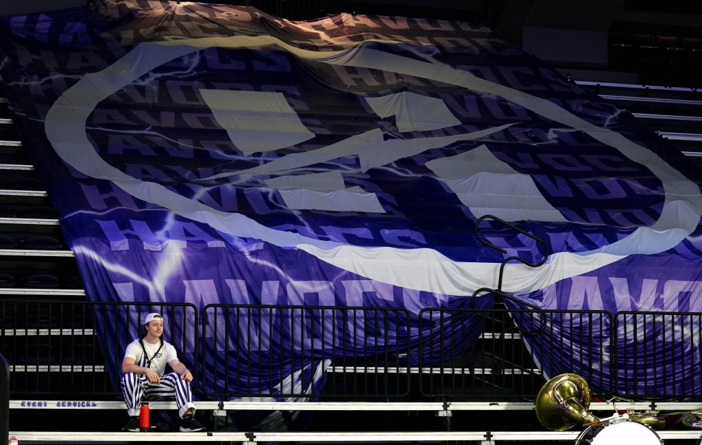 A lone Thundering Heard pep band member sits beneath the Havocs banner during Lope-A-Palooza at Global Credit Union Arena on Aug. 29, 2025. -