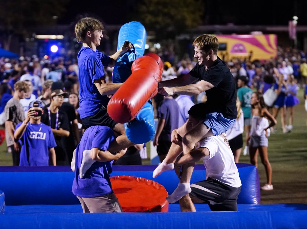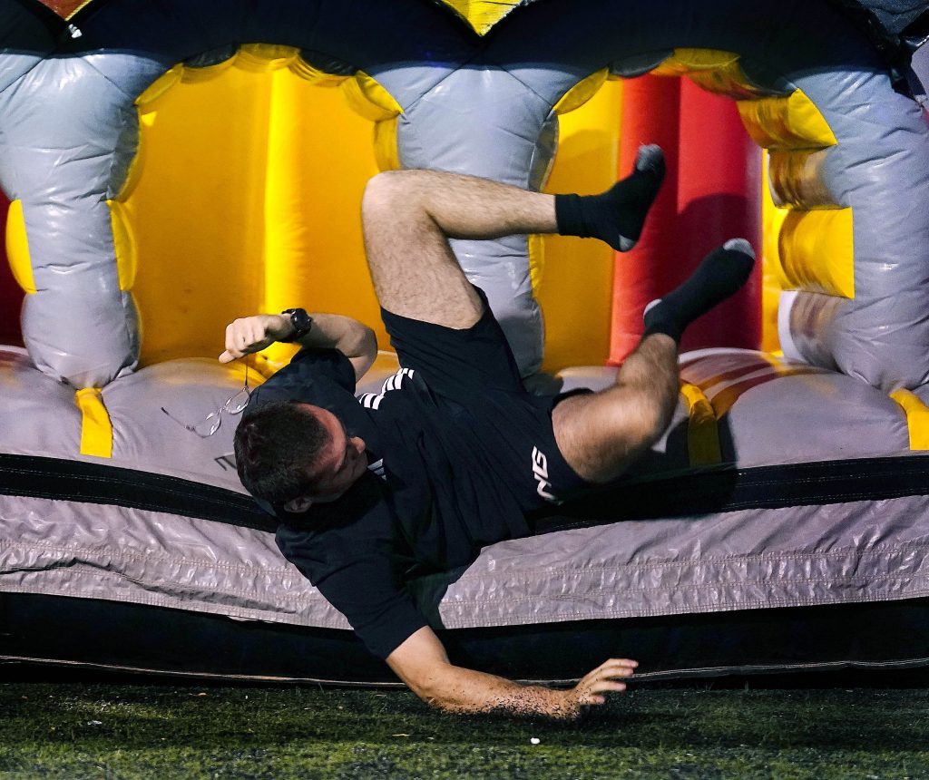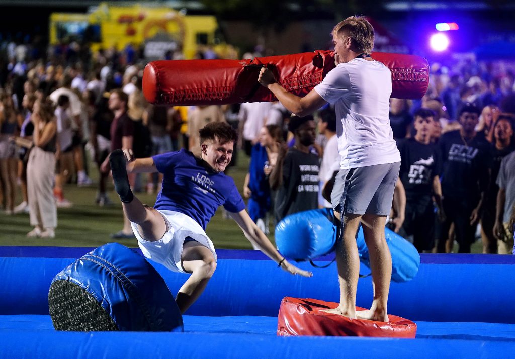 A student gets knocked off his pedestal during the Lope-A-Palooza Festival at Prescott Field on Aug. 29, 2025. -