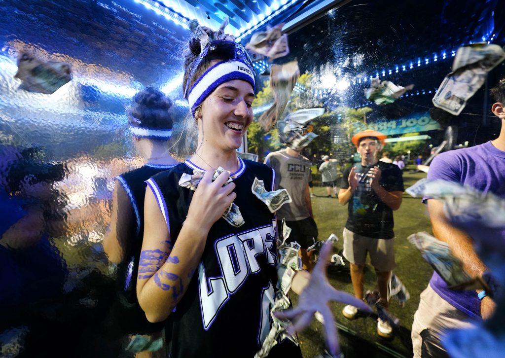 Students try to make a cash grab of prop money in the Money Machine during the Lope-A-Palooza Festival at Prescott Field on Aug. 29, 2025. -