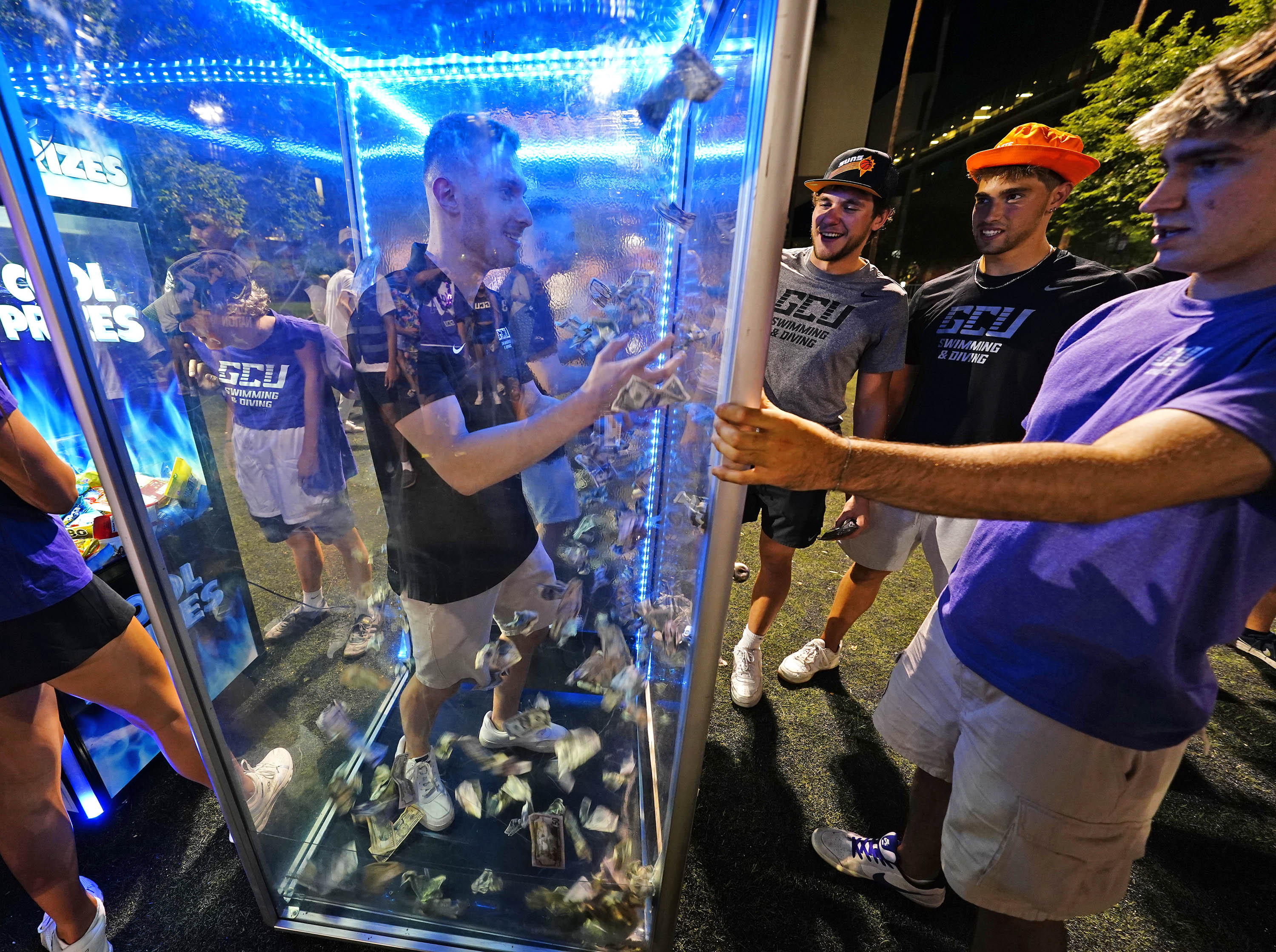 Students try to make a cash grab of prop money in the Money Machine during the Lope-A-Palooza Festival at Prescott Field on Aug. 29, 2025. -