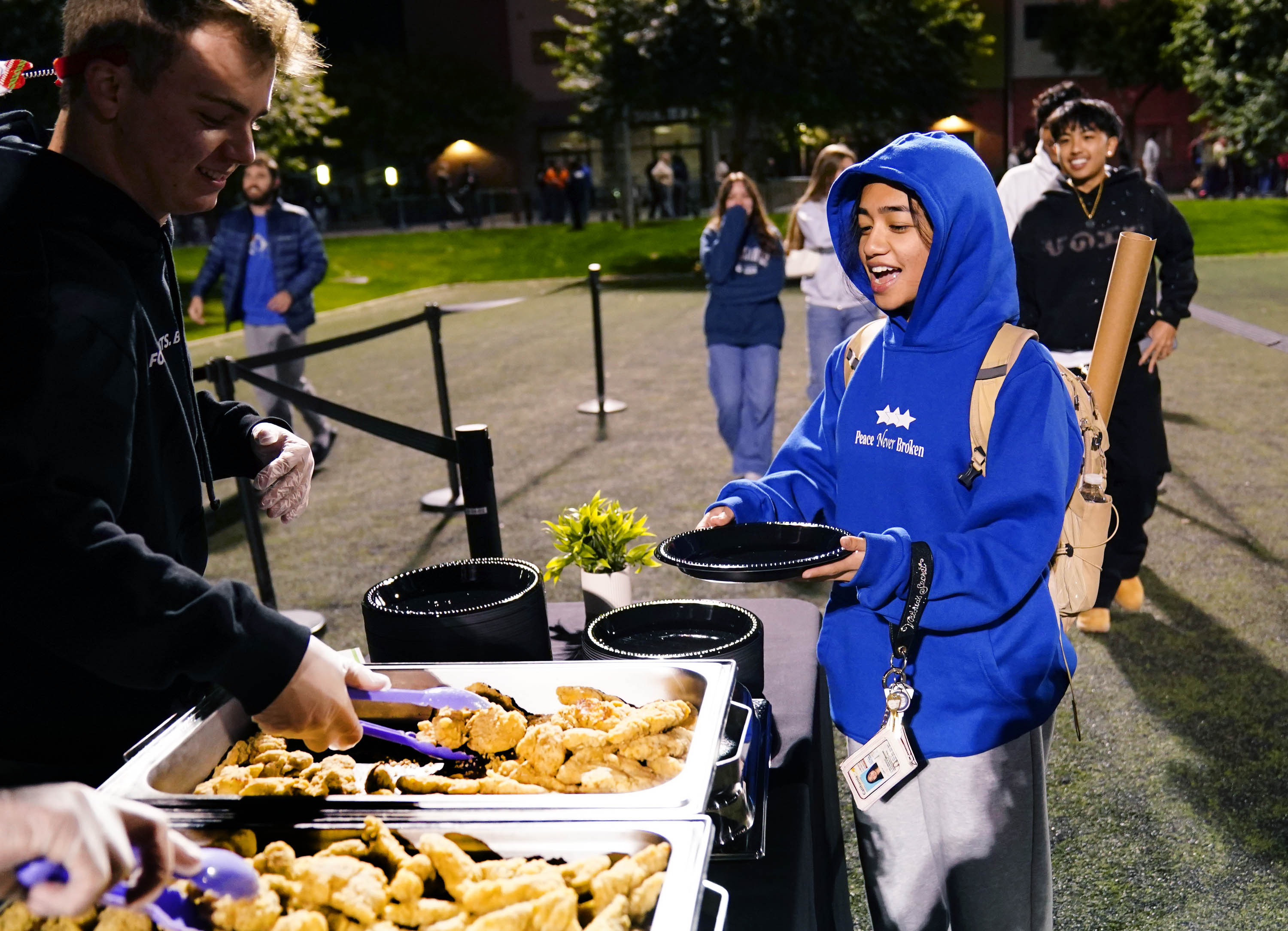 Students are treated to chicken and waffles during the ASGCU-sponsored Midnight Breakfast in Whoville at Prescott Field on Dec. 3, 2025. -