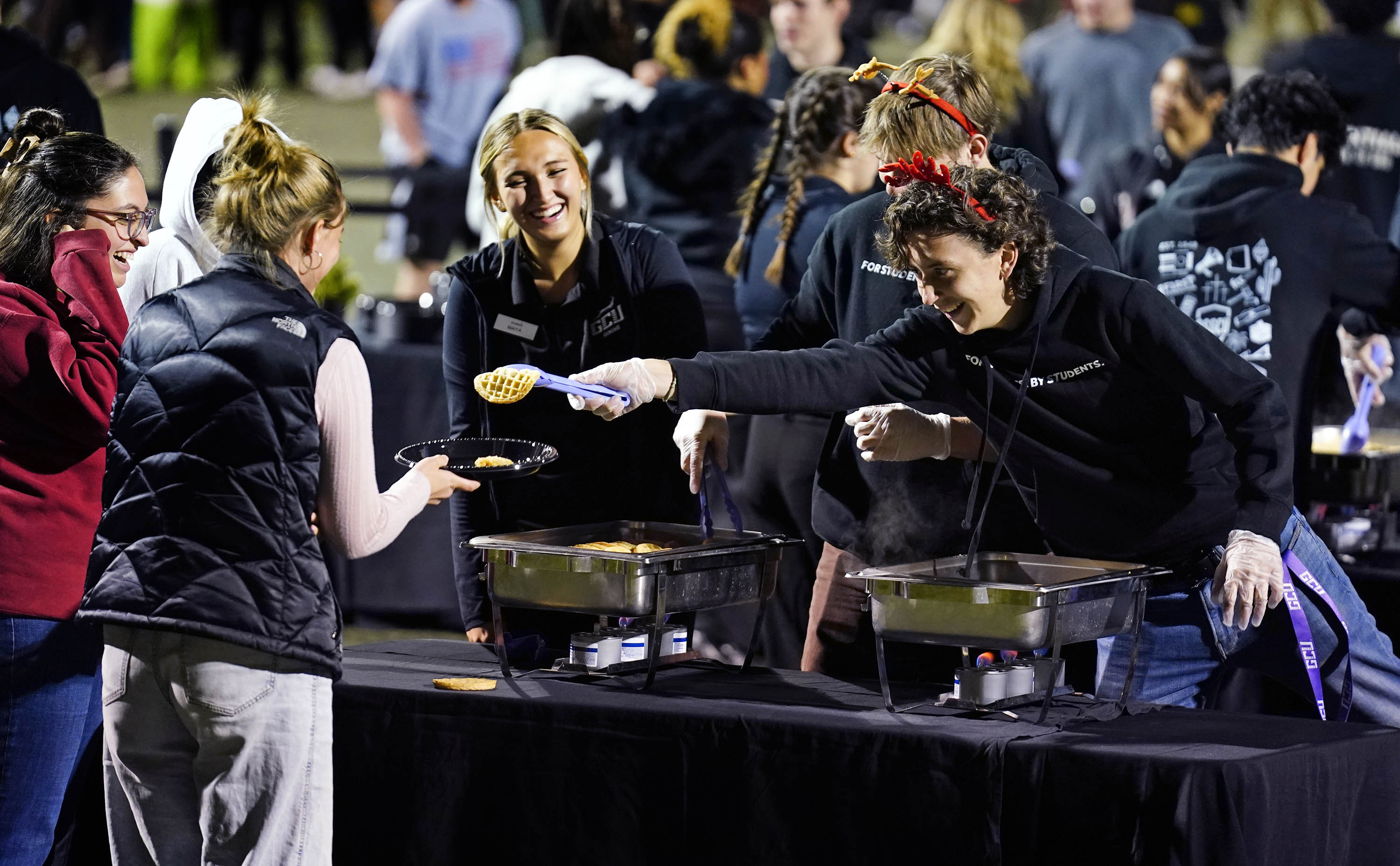 An ASGCU member insists a student tries a waffle during Midnight Breakfast in Whoville at Prescott Field on Dec. 3, 2025. -