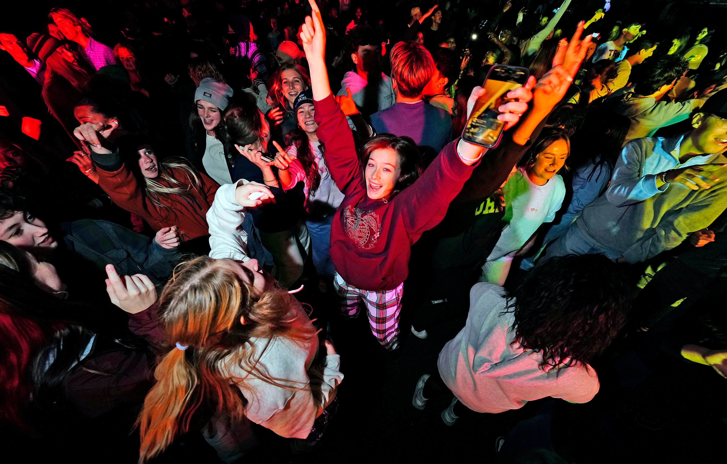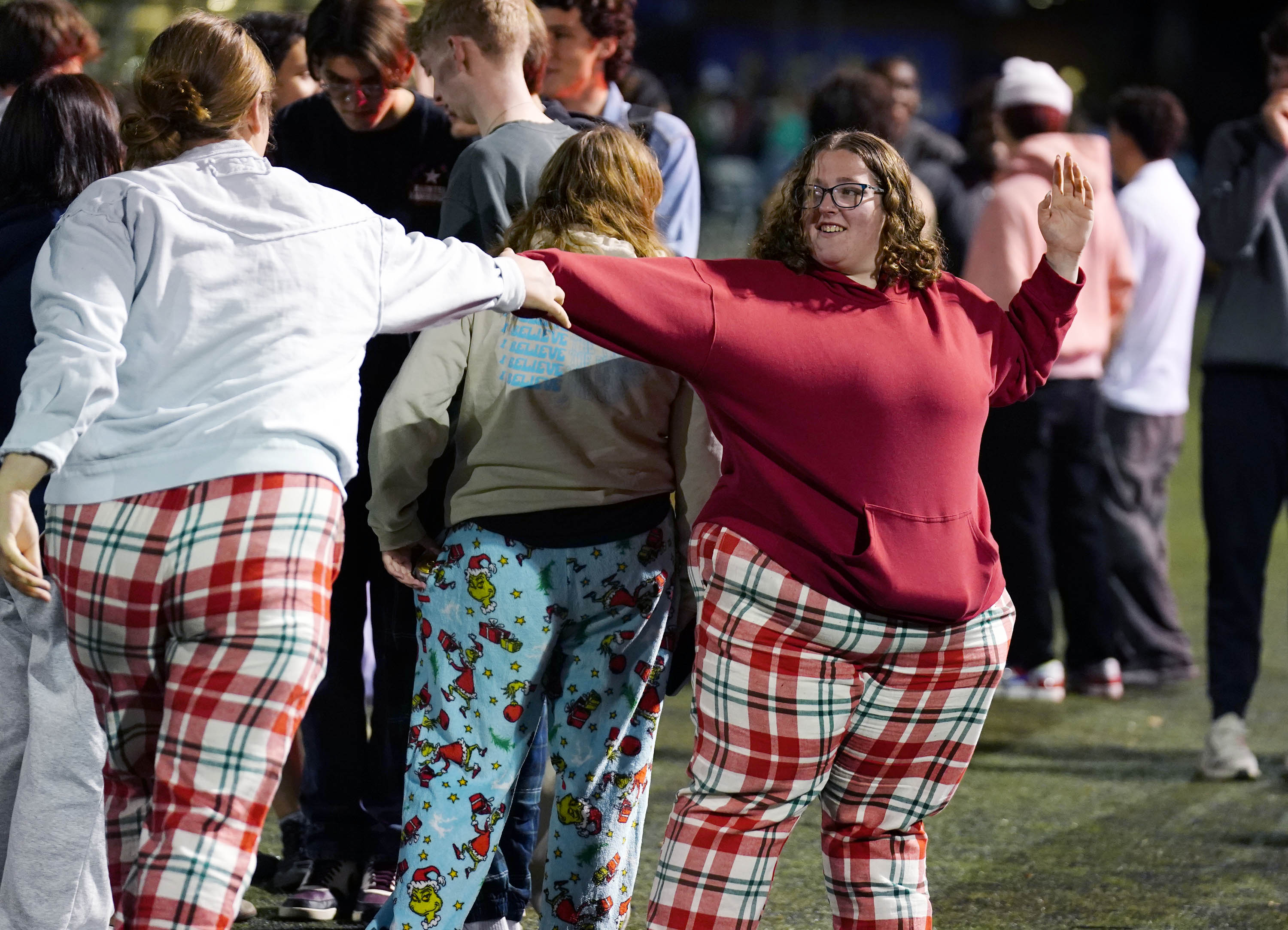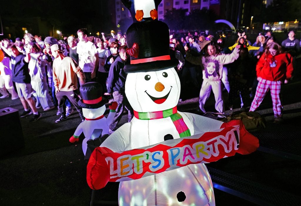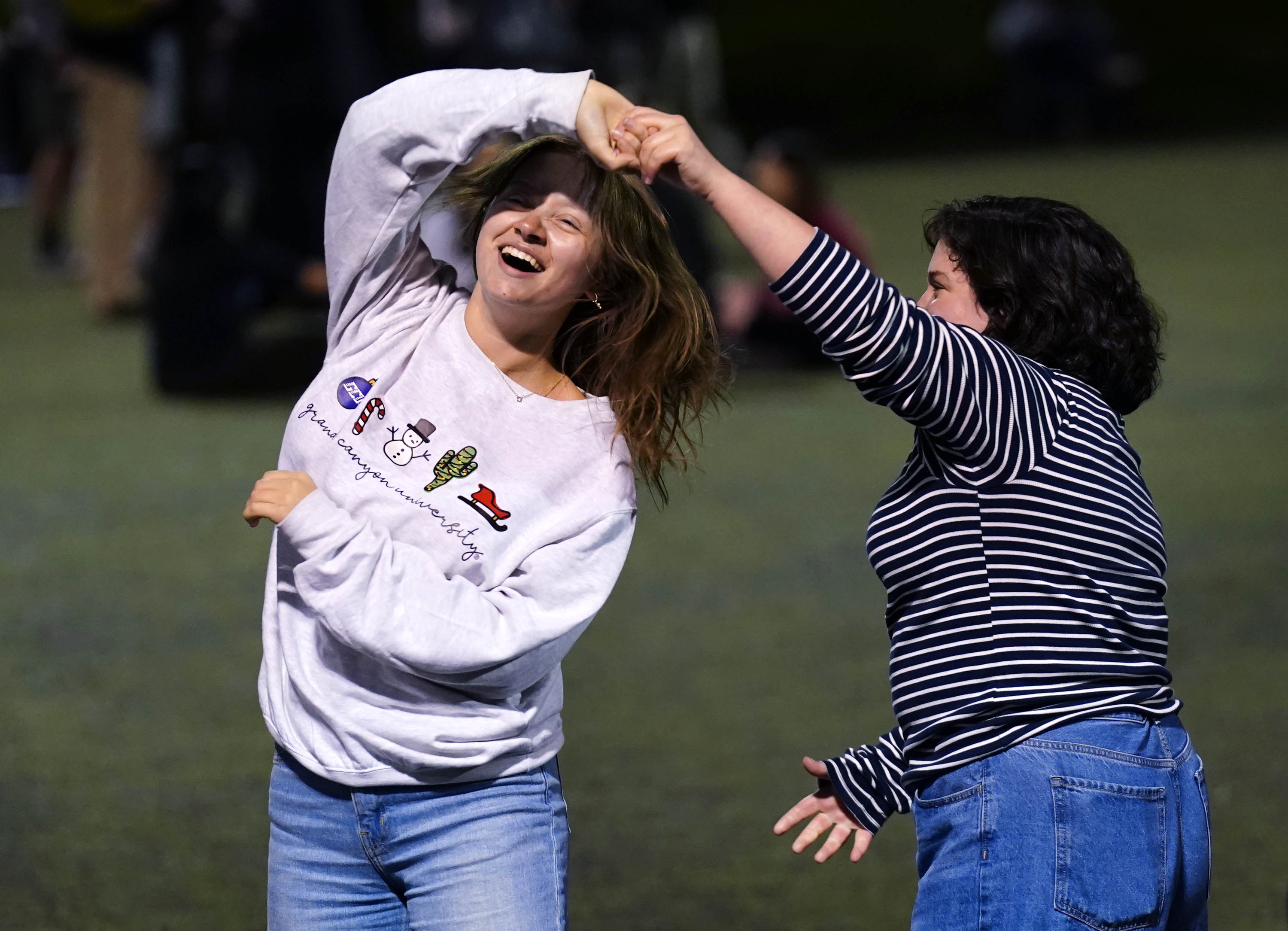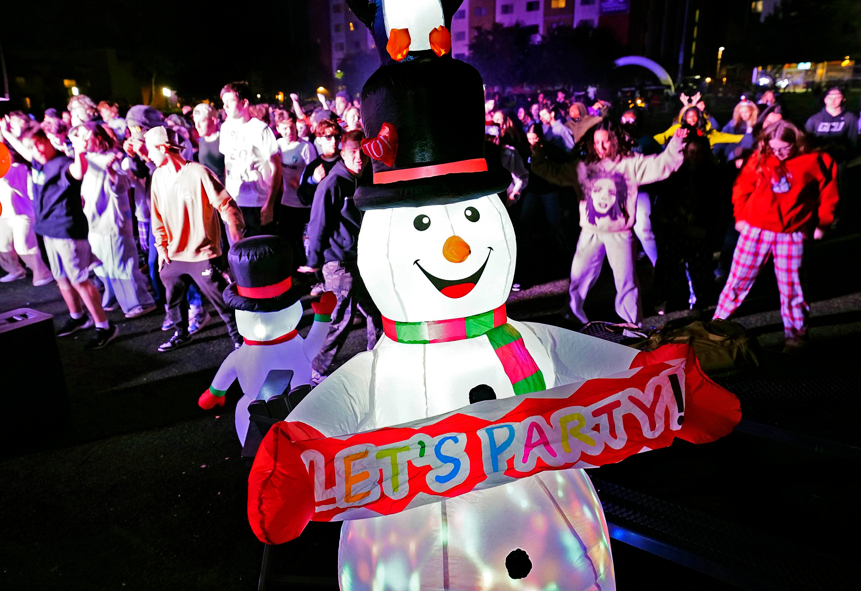 Students dance to Christmas music during the ASGCU-sponsored Midnight Breakfast in Whoville at Prescott Field on Dec. 3, 2025. -