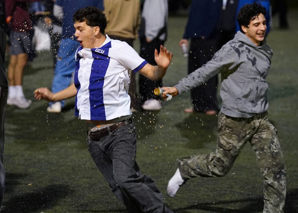 A student reacts as he gets doused with an ice cold Celsius drink during the ASGCU-sponsored Midnight Breakfast in Whoville at Prescott Field on Dec. 3, 2025. -