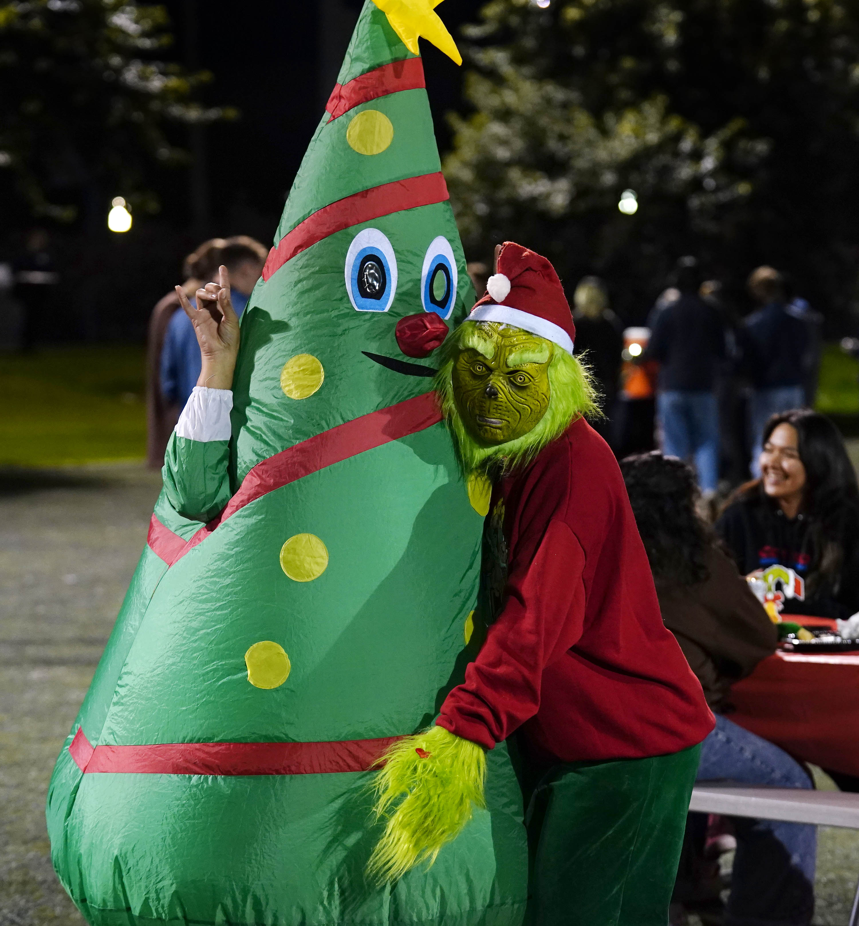 The Grinch has thoughts of stealing this Christmas tree during the ASGCU-sponsored Midnight Breakfast in Whoville at Prescott Field on Dec. 3, 2025. -
