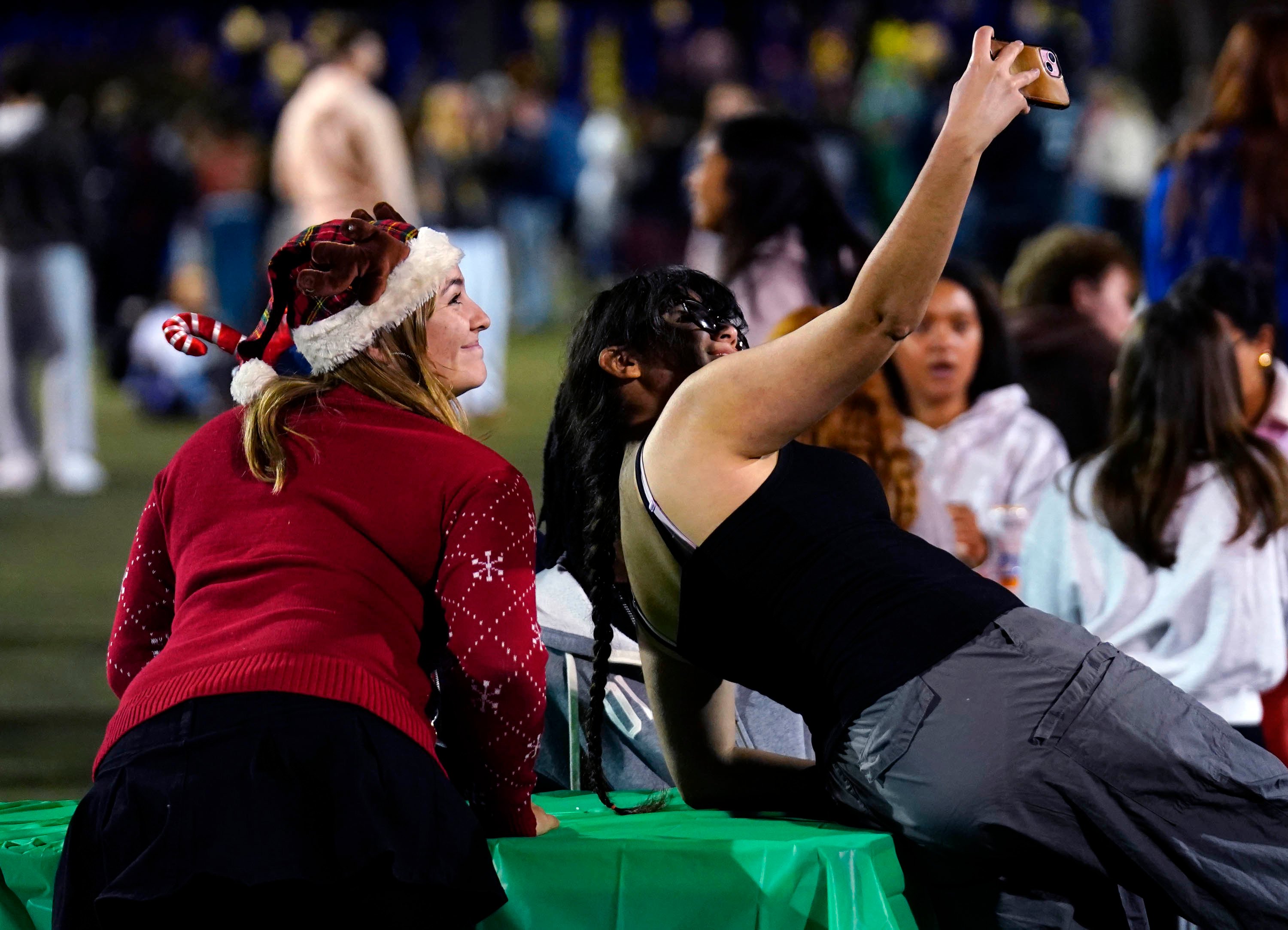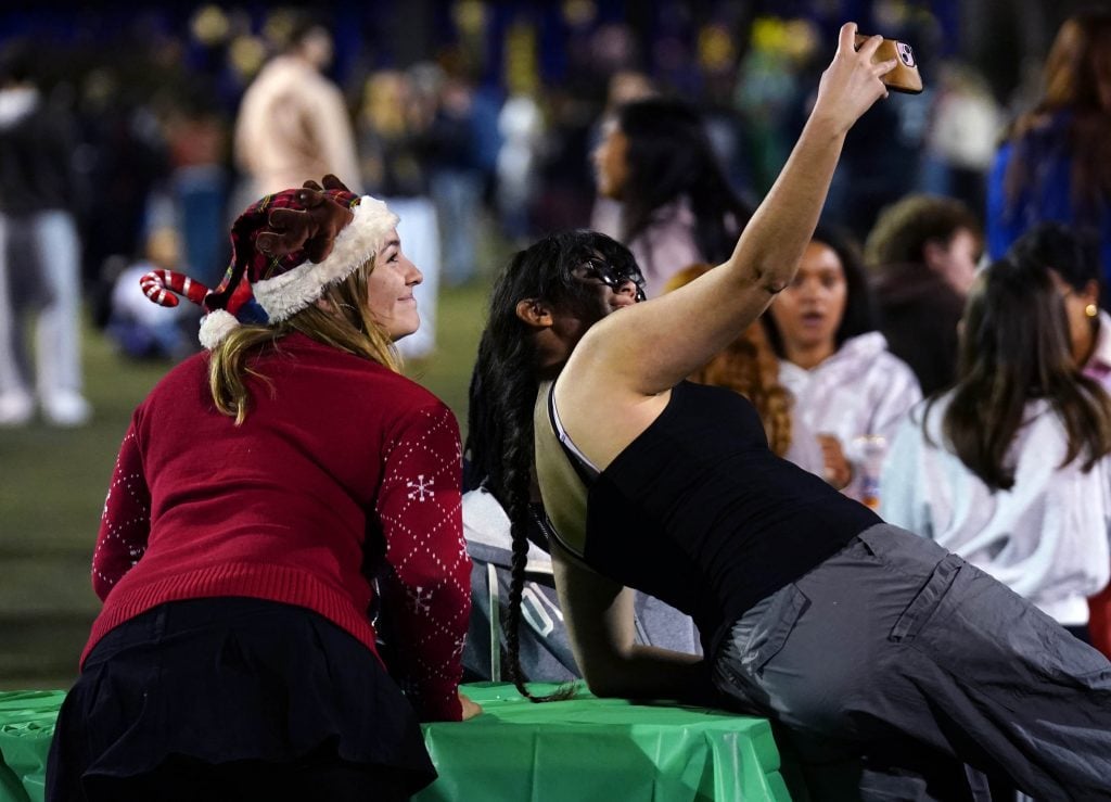 Students take selfies during the ASGCU-sponsored Midnight Breakfast in Whoville at Prescott Field on Dec. 3, 2025. -