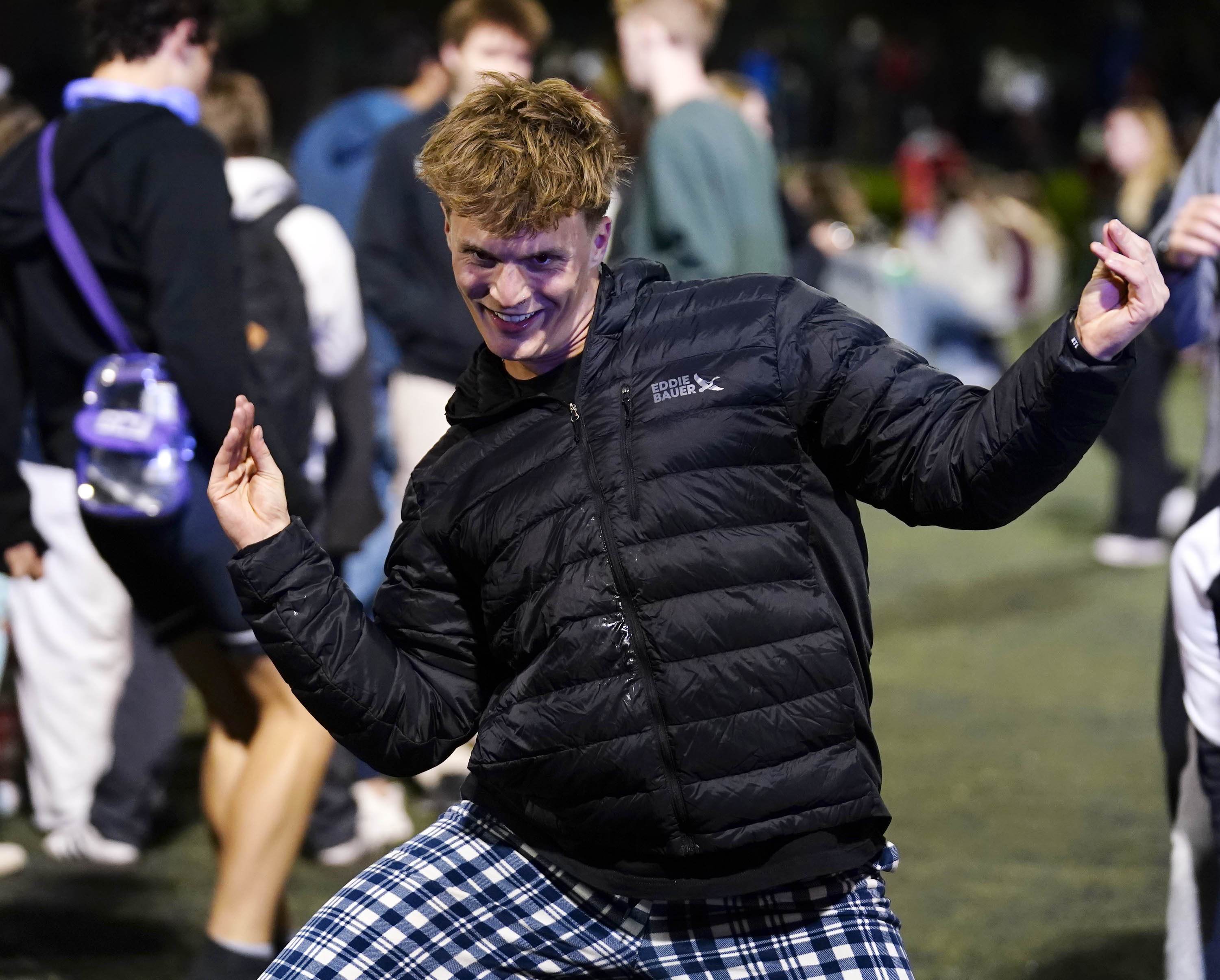 A student shows off his dance moves during the ASGCU-sponsored Midnight Breakfast in Whoville at Prescott Field on Dec. 3, 2025. -