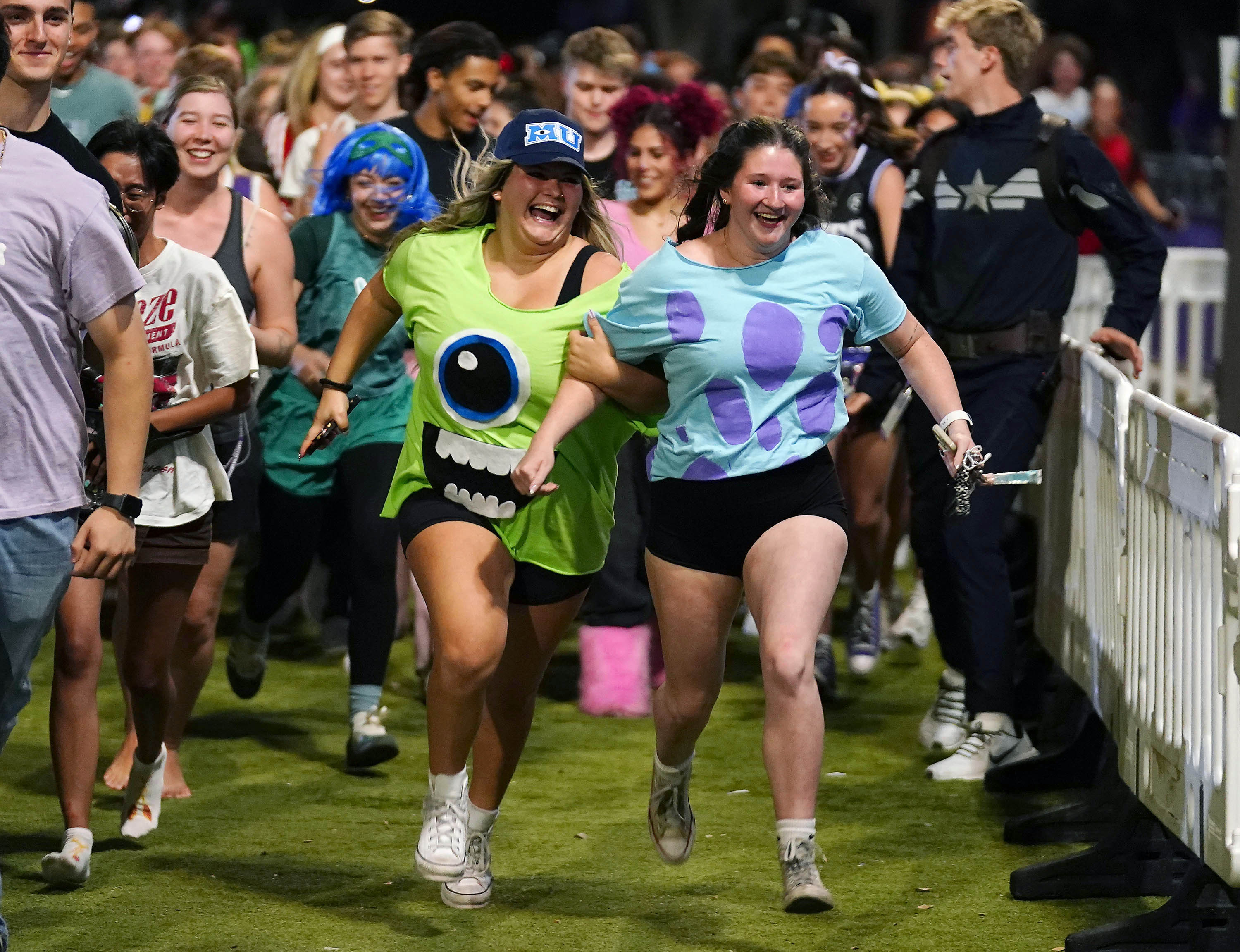 Students dash to the entrances of Global Credit Union Arena as the doors open for Midnight Madness on Oct. 3, 2025. -