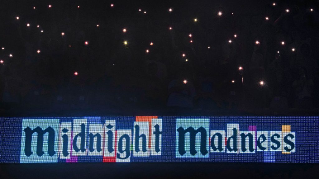 The opening credit is shown during Midnight Madness at Global Credit Union Arena on Oct. 3, 2025 -