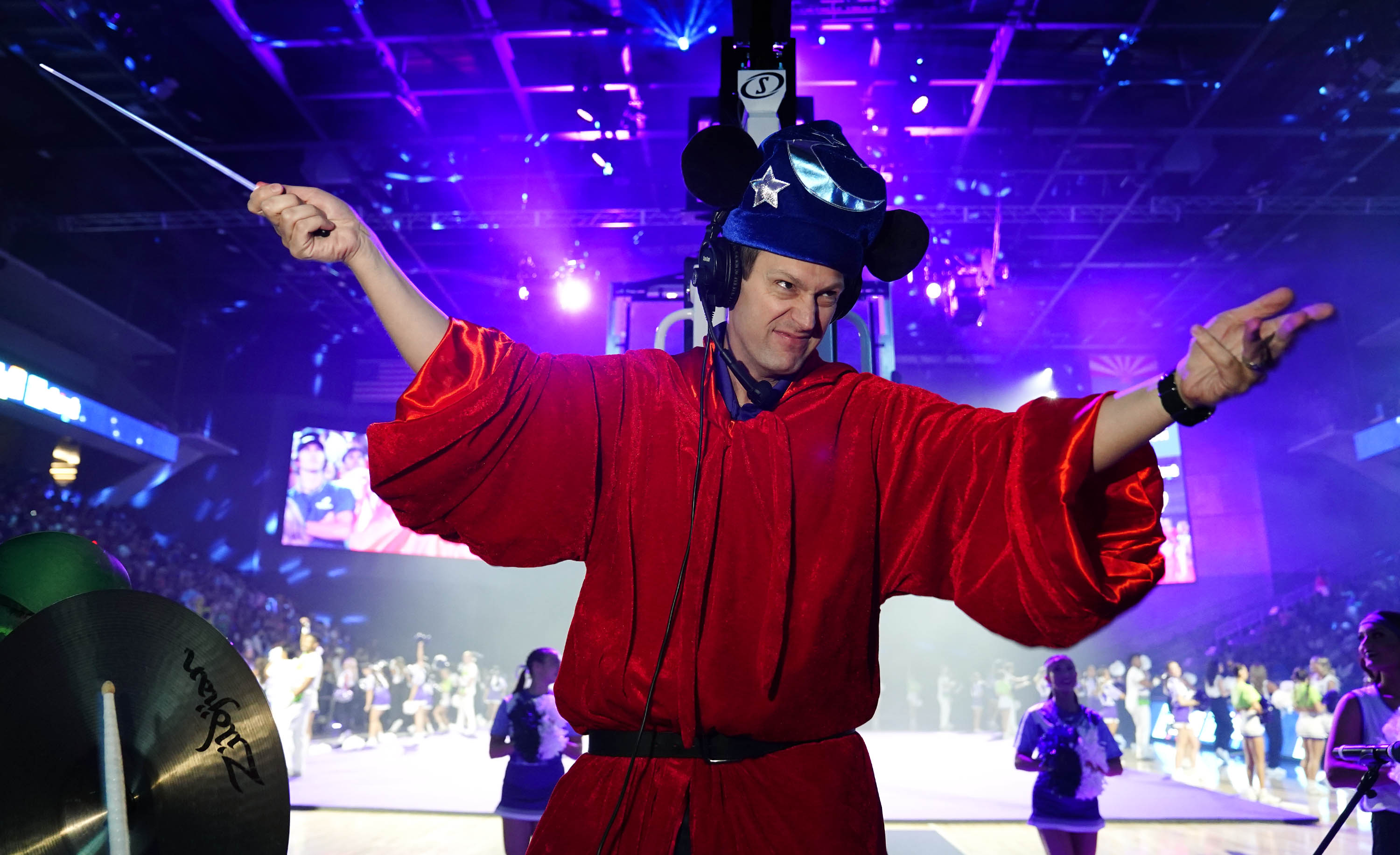 Thundering Heard Pep Band director Kevin Bock conjures up some Mickey Mouse "Fantasia" during Midnight Madness at Global Credit Union Arena on Oct. 3, 2025. -