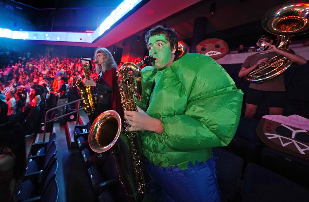 A Thundering Heard Pep Band member is a Hulk on saxophone during Midnight Madness at Global Credit Union Arena on Oct. 3, 2025 -