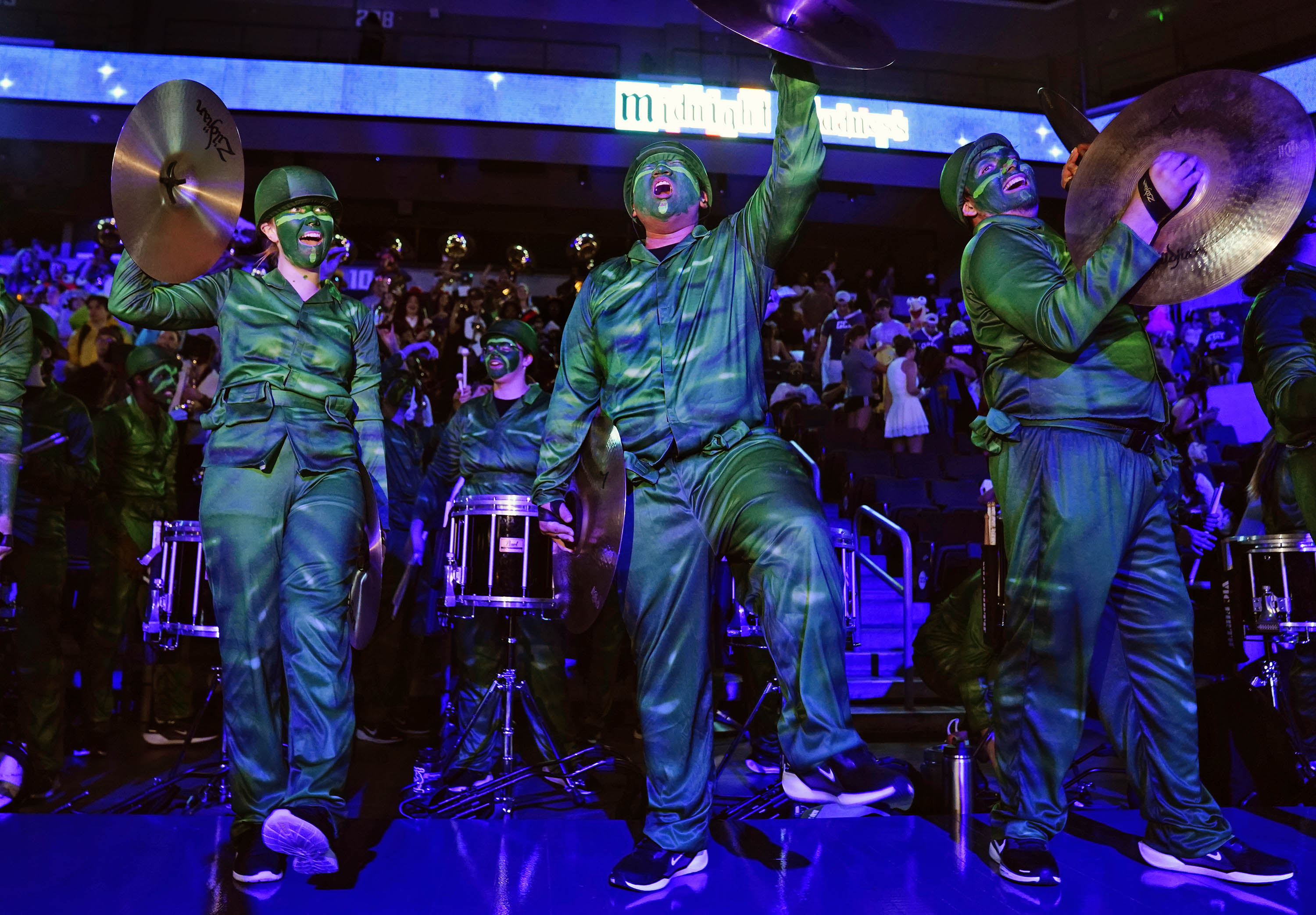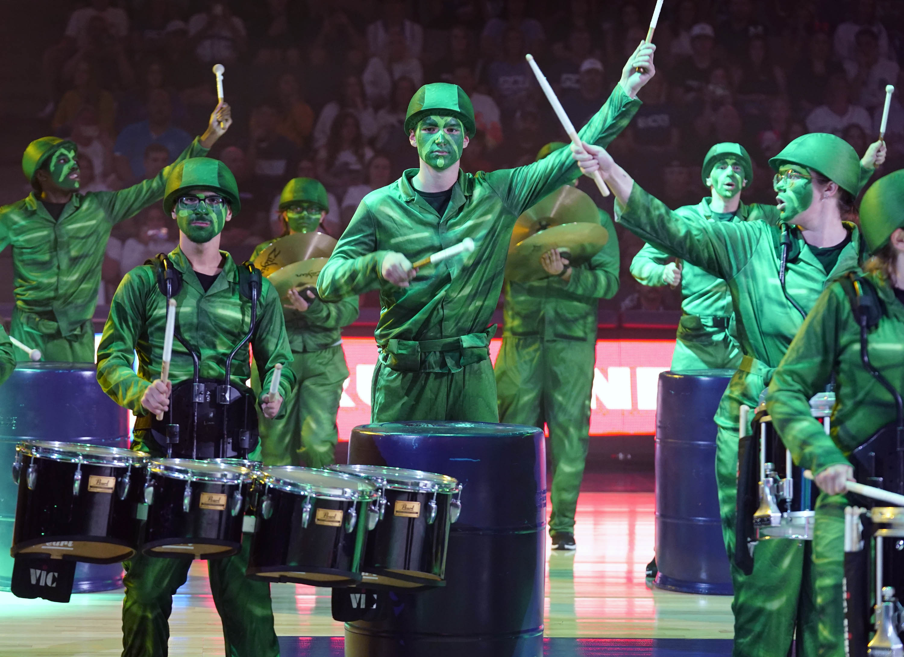 The Thundering Heard Pep Band drumline performs as "Toy Story" Army men during Midnight Madness at Global Credit Union Arena on Oct. 3, 2025 -