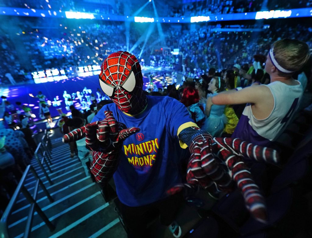 Spiderman is ready to spin a web of fun during Midnight Madness at Global Credit Union Arena on Oct. 3, 2025 -