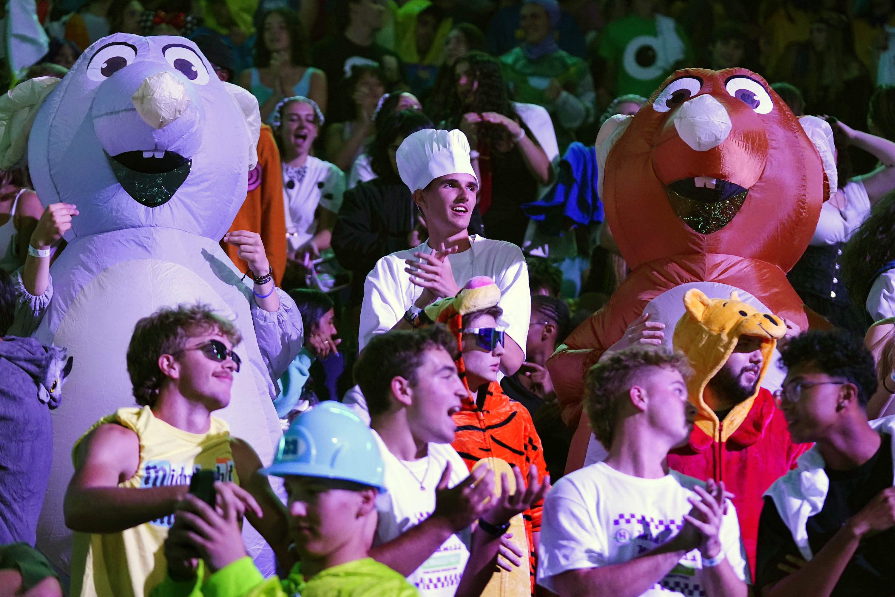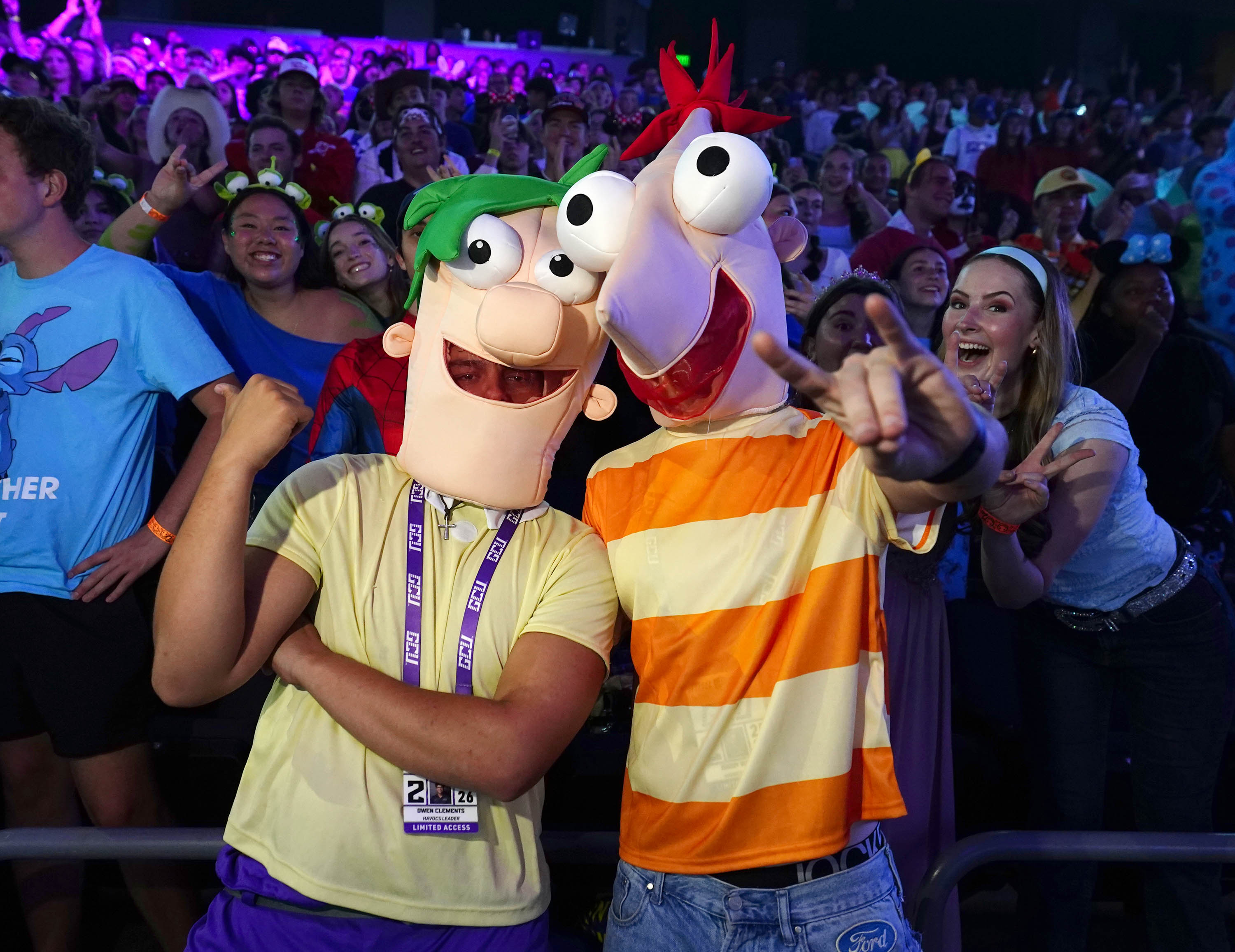 Students dressed as the characters Phineas and Ferb during Midnight Madness at Global Credit Union Arena on Oct. 3, 2025 -