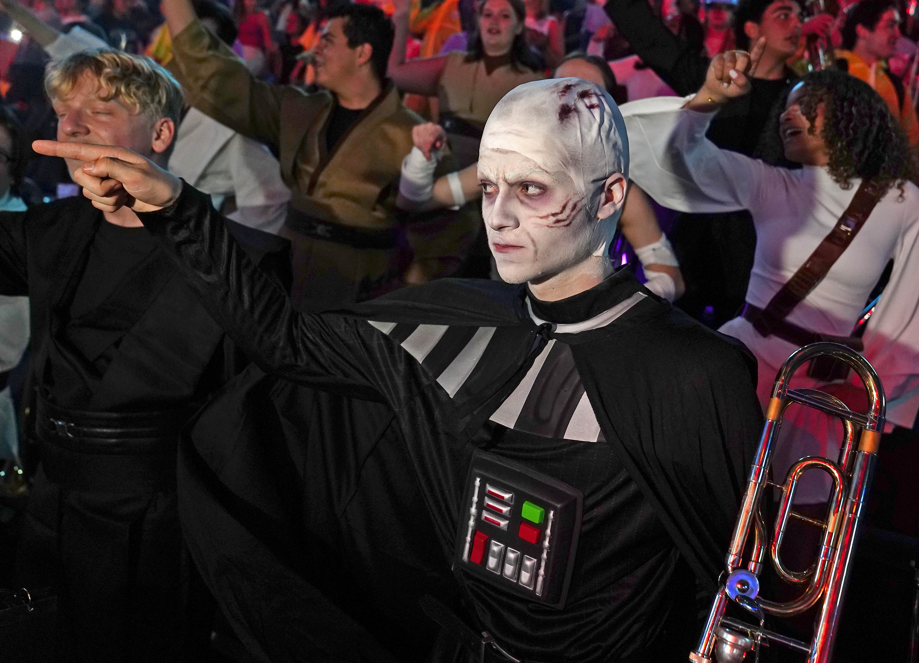 You Don’t Know the Power of the Pep Band! ... A Thundering Heard Pep Band member as "Return of the Jedi" Darth Vader during Midnight Madness at Global Credit Union Arena on Oct. 3, 2025 -