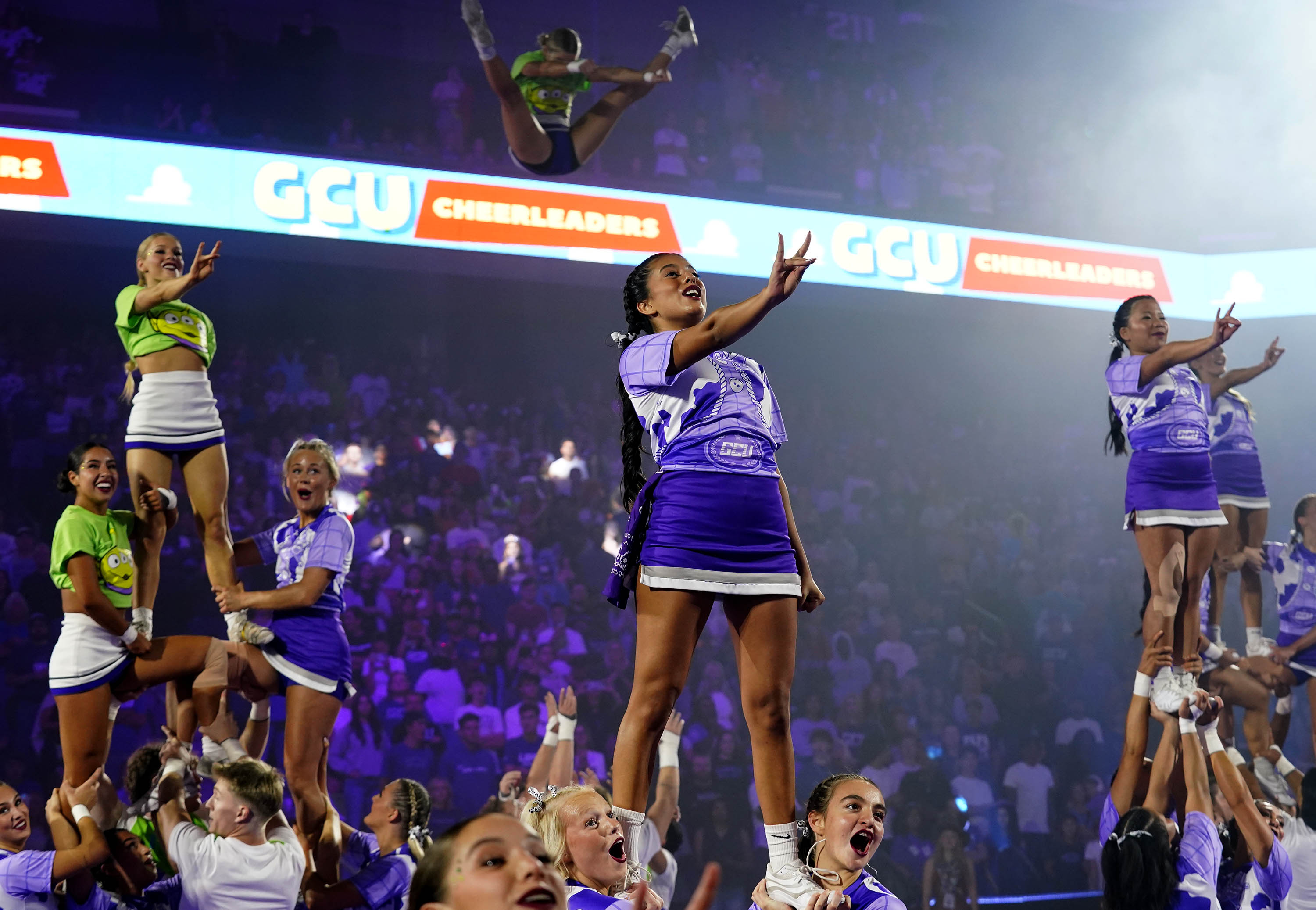 The GCU Cheerleaders perform during Midnight Madness at Global Credit Union Arena on Oct. 3, 2025 -