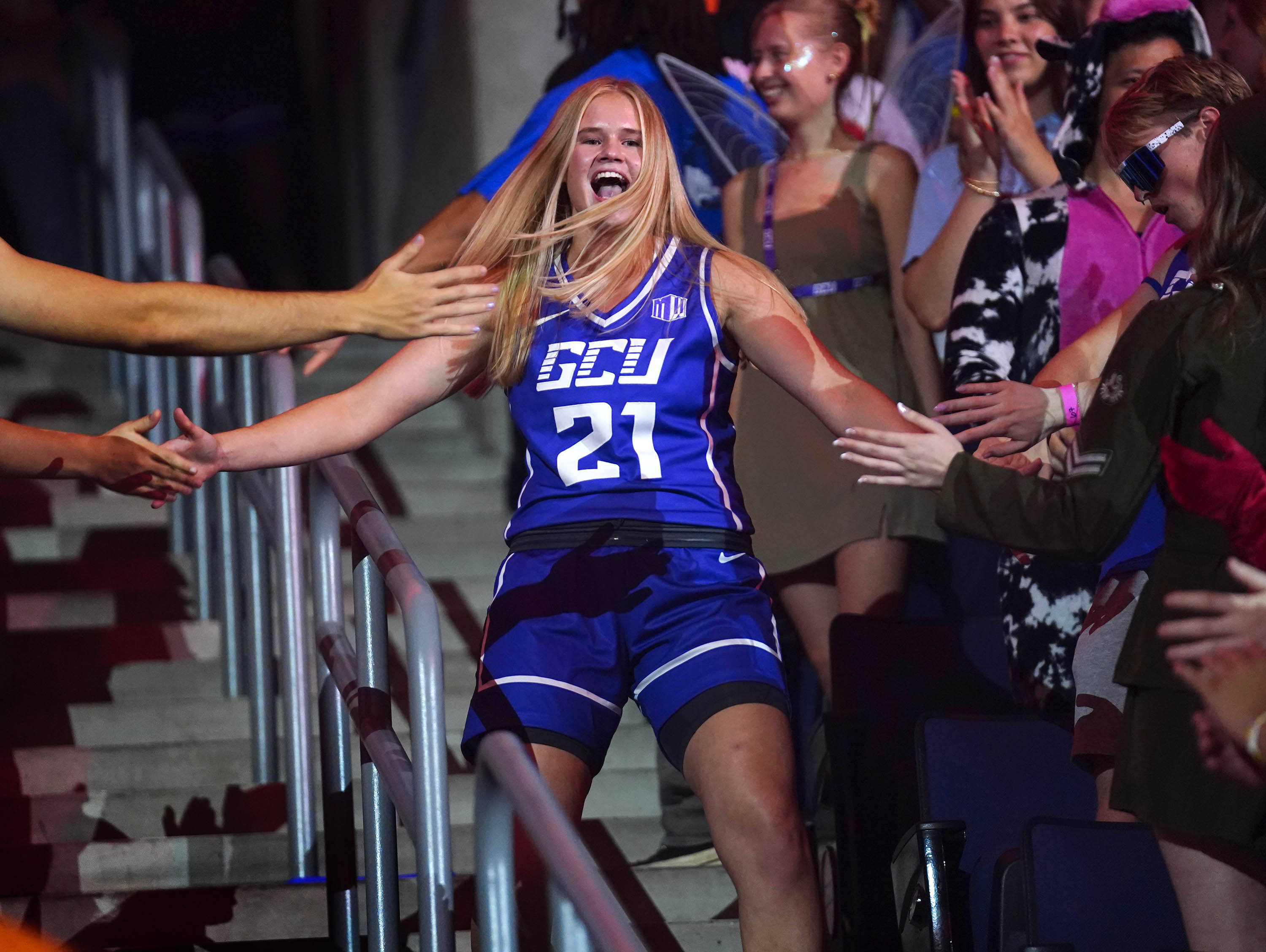 GCU women’s basketball forward Sophia Fontaine is greeted by students during Midnight Madness at Global Credit Union Arena on Oct. 3, 2025 -