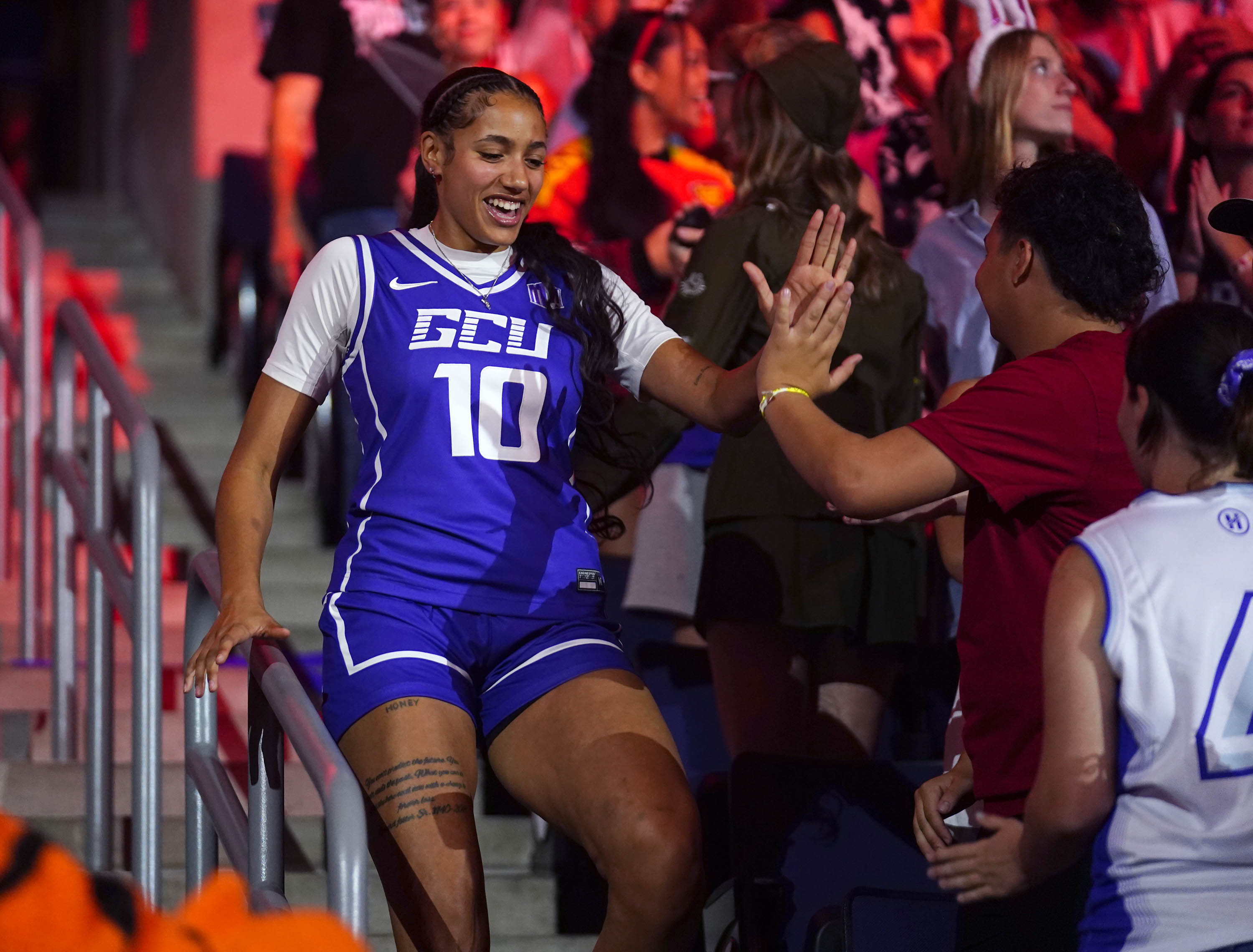 GCU women’s basketball guard Sidney Anderson is greeted by students during Midnight Madness at Global Credit Union Arena on Oct. 3, 2025 -