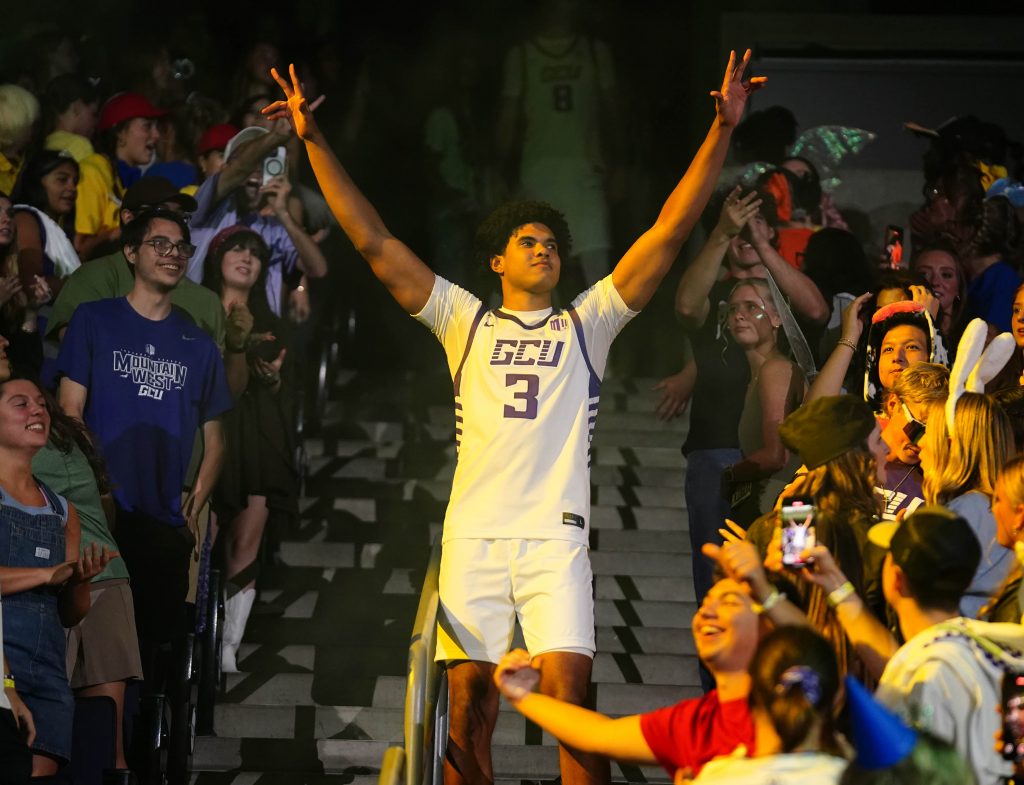 GCU men’s basketball guard Braylon Johnson is greeted by students during Midnight Madness at Global Credit Union Arena on Oct. 3, 2025 -