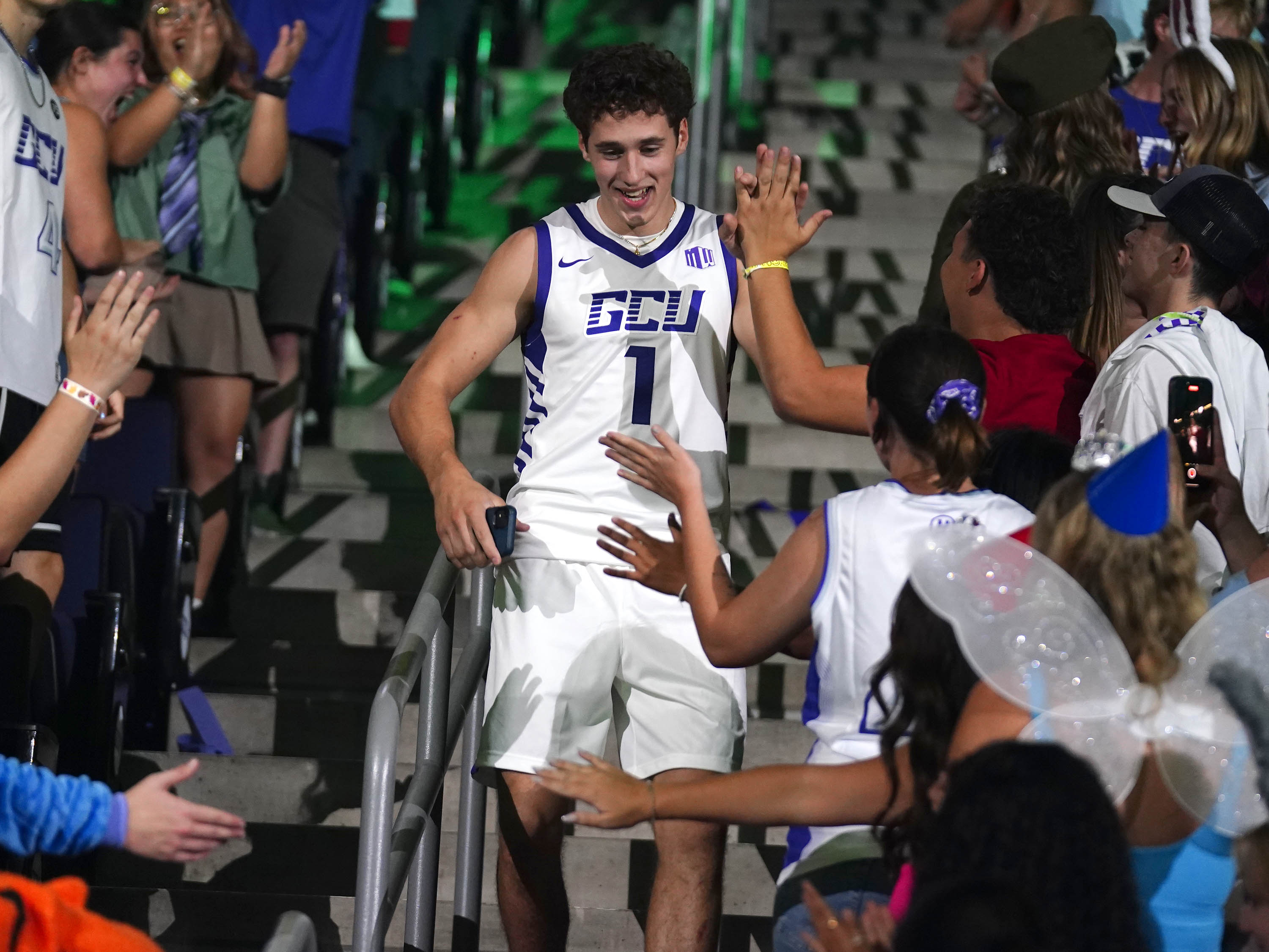 GCU men’s basketball guard Luke Shaw is greeted by students during Midnight Madness at Global Credit Union Arena on Oct. 3, 2025 -