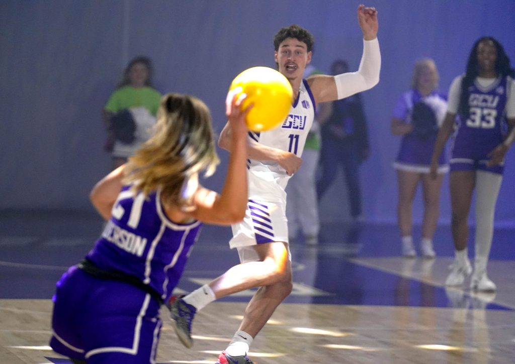 GCU men’s basketball guard Caleb Shaw looks to avoid getting hit by women’s basketball guard Sidney Anderson in a game of dodgeball during Midnight Madness at Global Credit Union Arena on Oct. 3, 2025 -