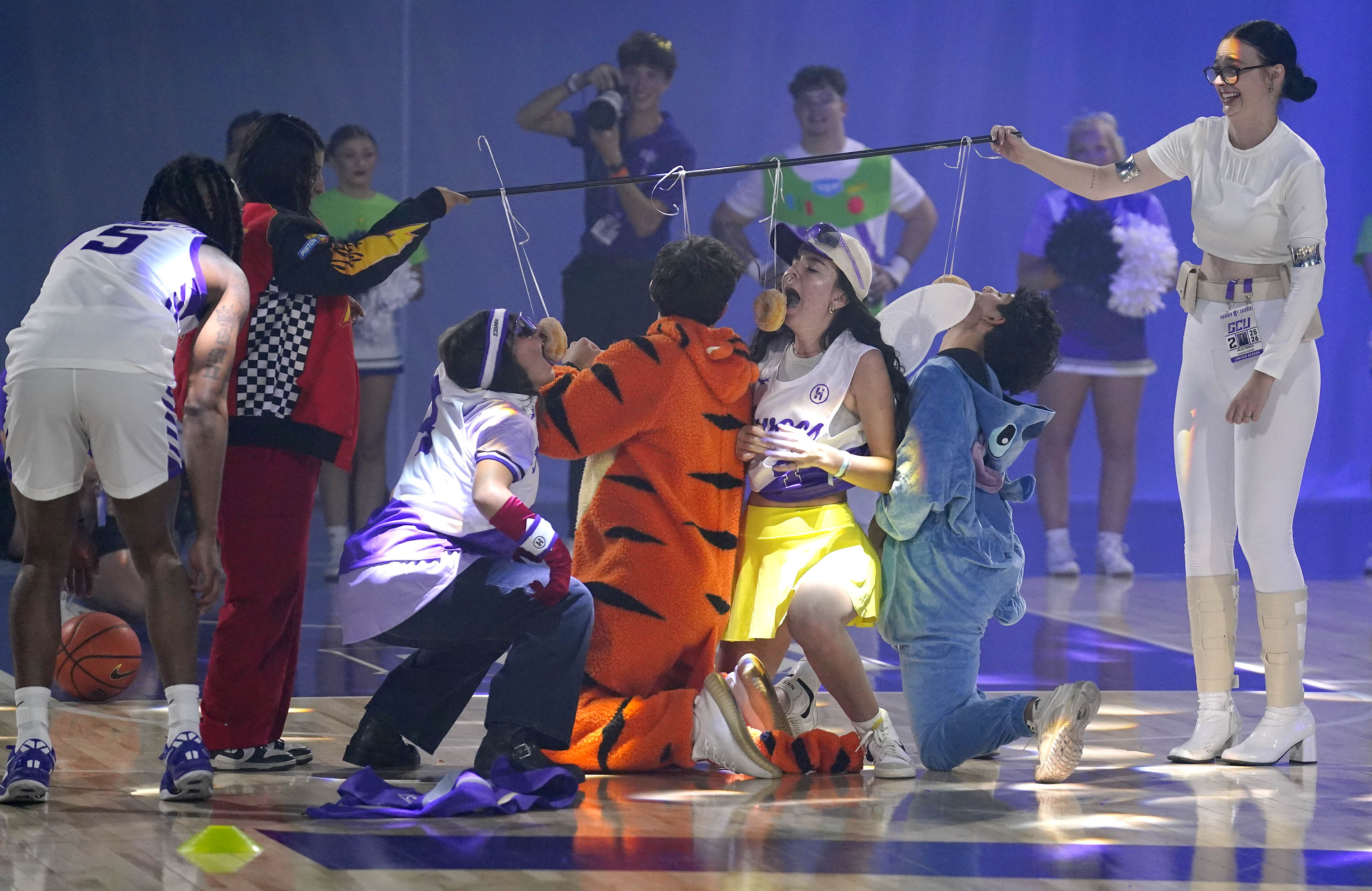 Havoc leaders race to eat a doughnut without using their hands in a competition during Midnight Madness at Global Credit Union Arena on Oct. 3, 2025 -