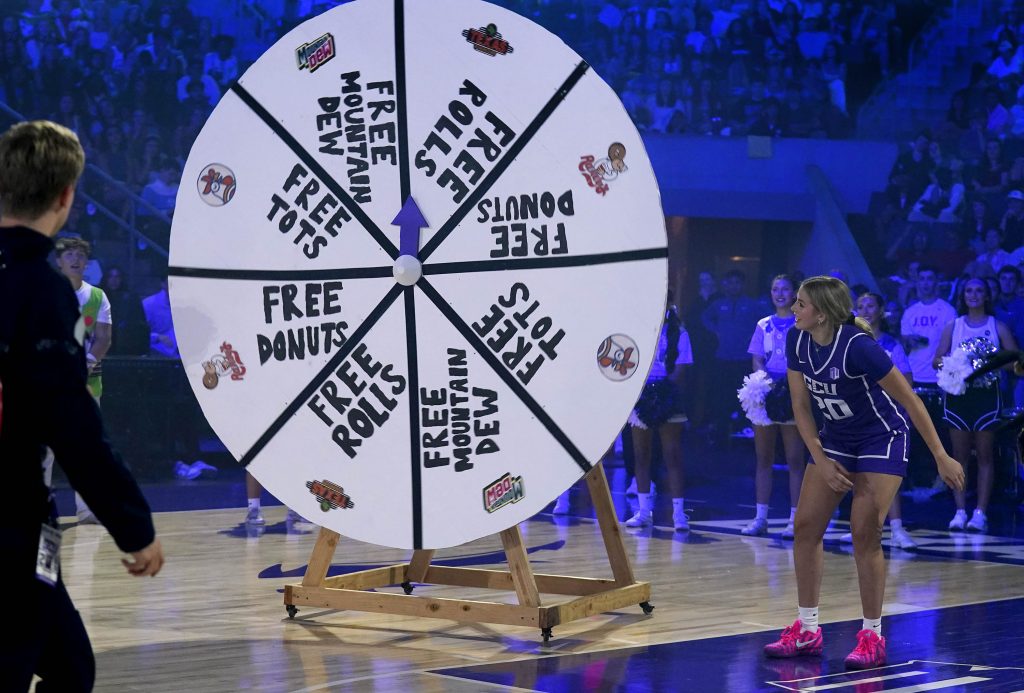 GCU women’s basketball guard Julianna LaMendola spins a giant prize wheel for her section during Midnight Madness at Global Credit Union Arena on Oct. 3, 2025 -