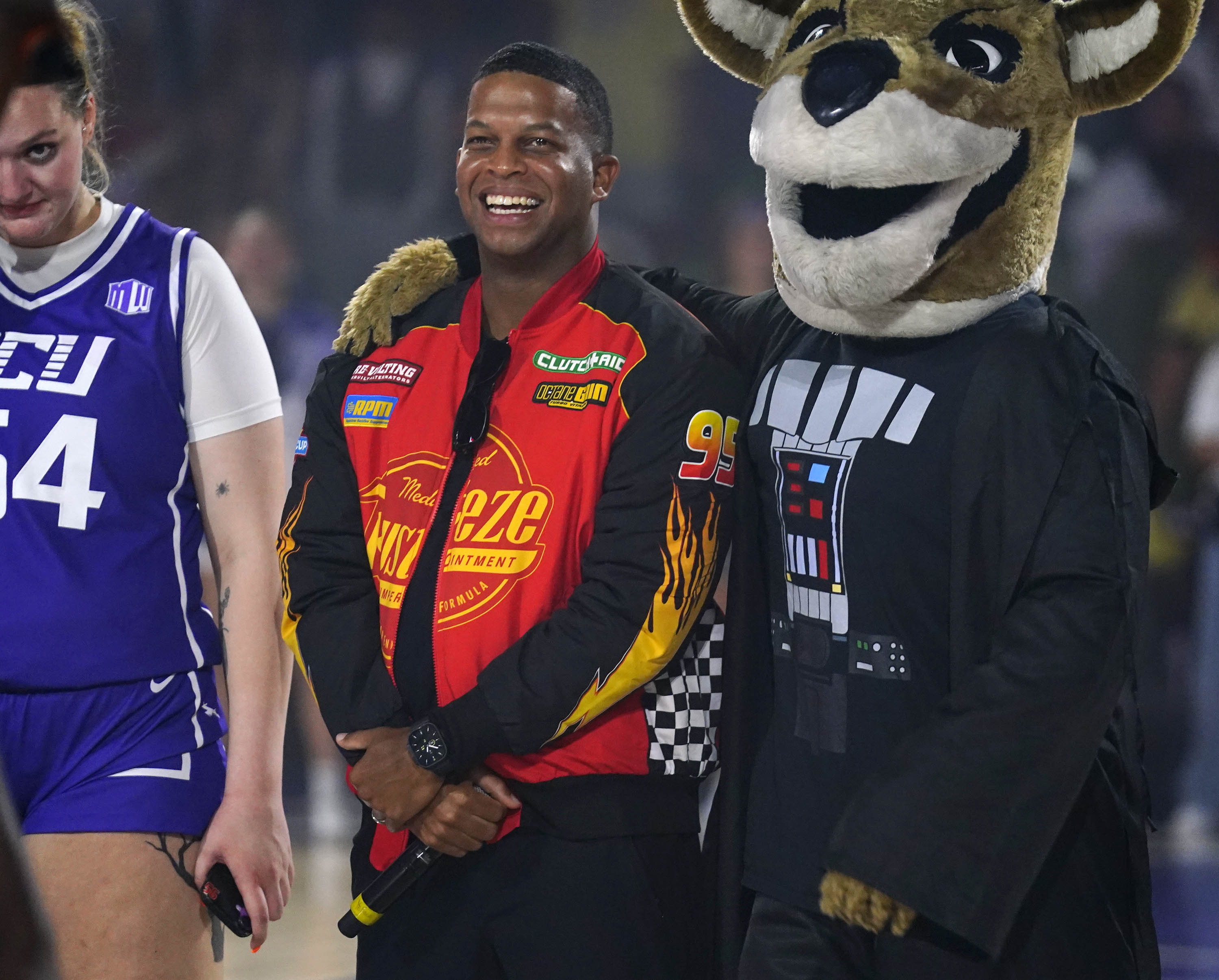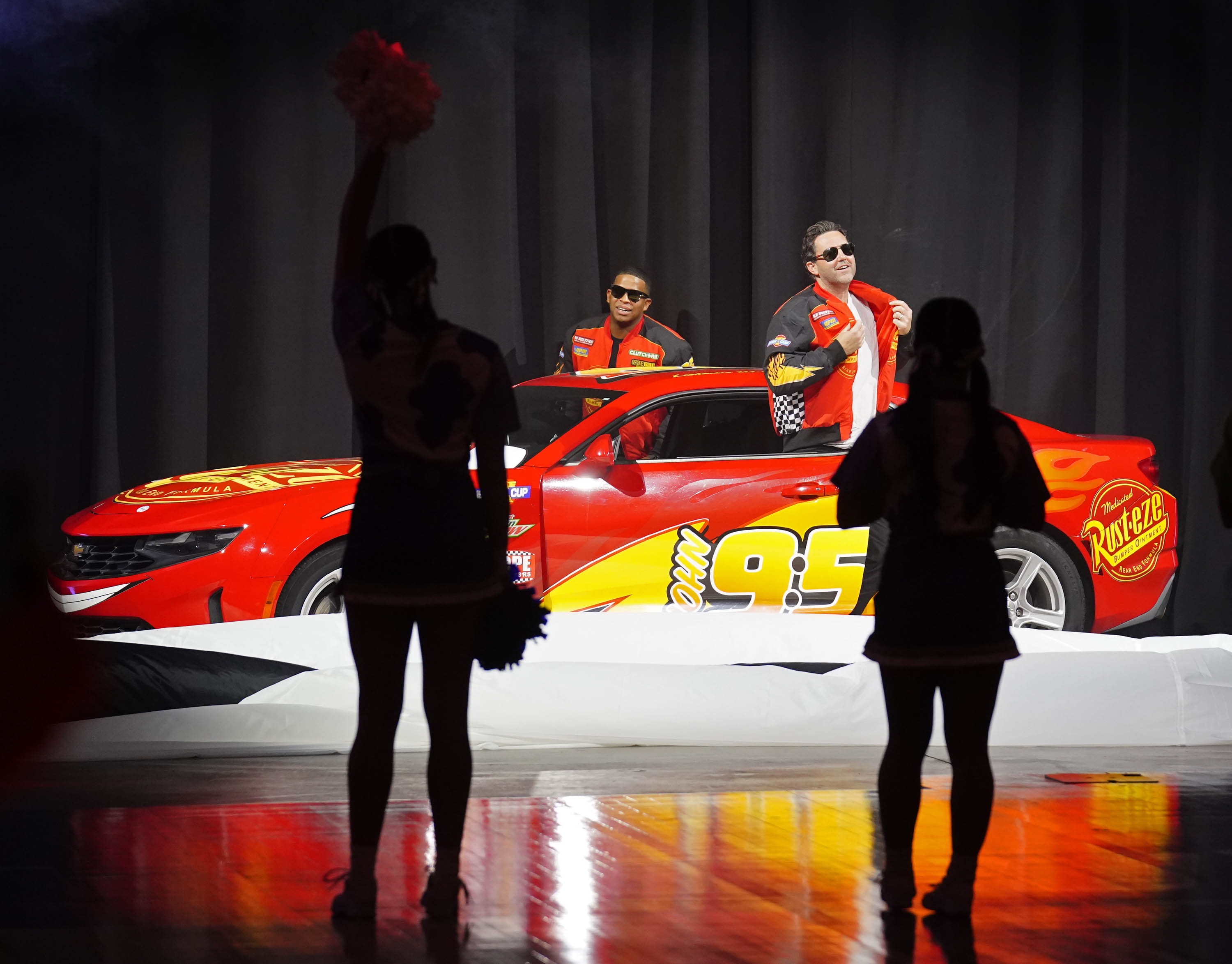 GCU women’s basketball head coach Winston Gandy (left) and men’s basketball coach Bryce Drew arrive in a Lightning McQueen Chevy Camaro during Midnight Madness at Global Credit Union Arena on Oct. 3, 2025 -