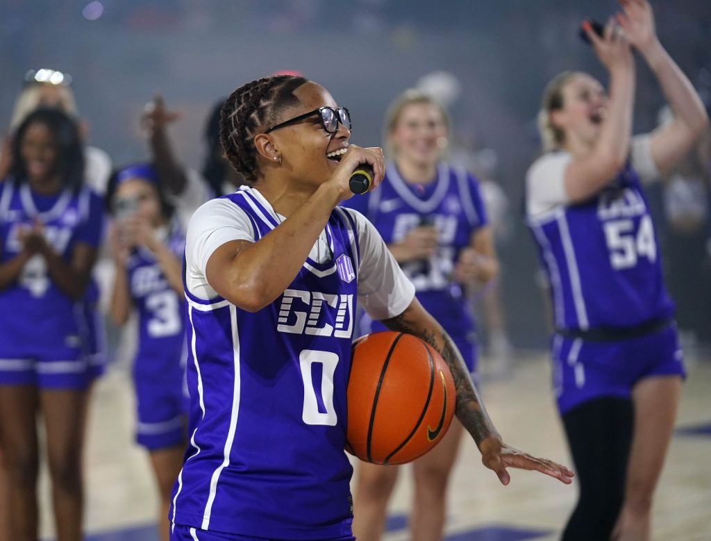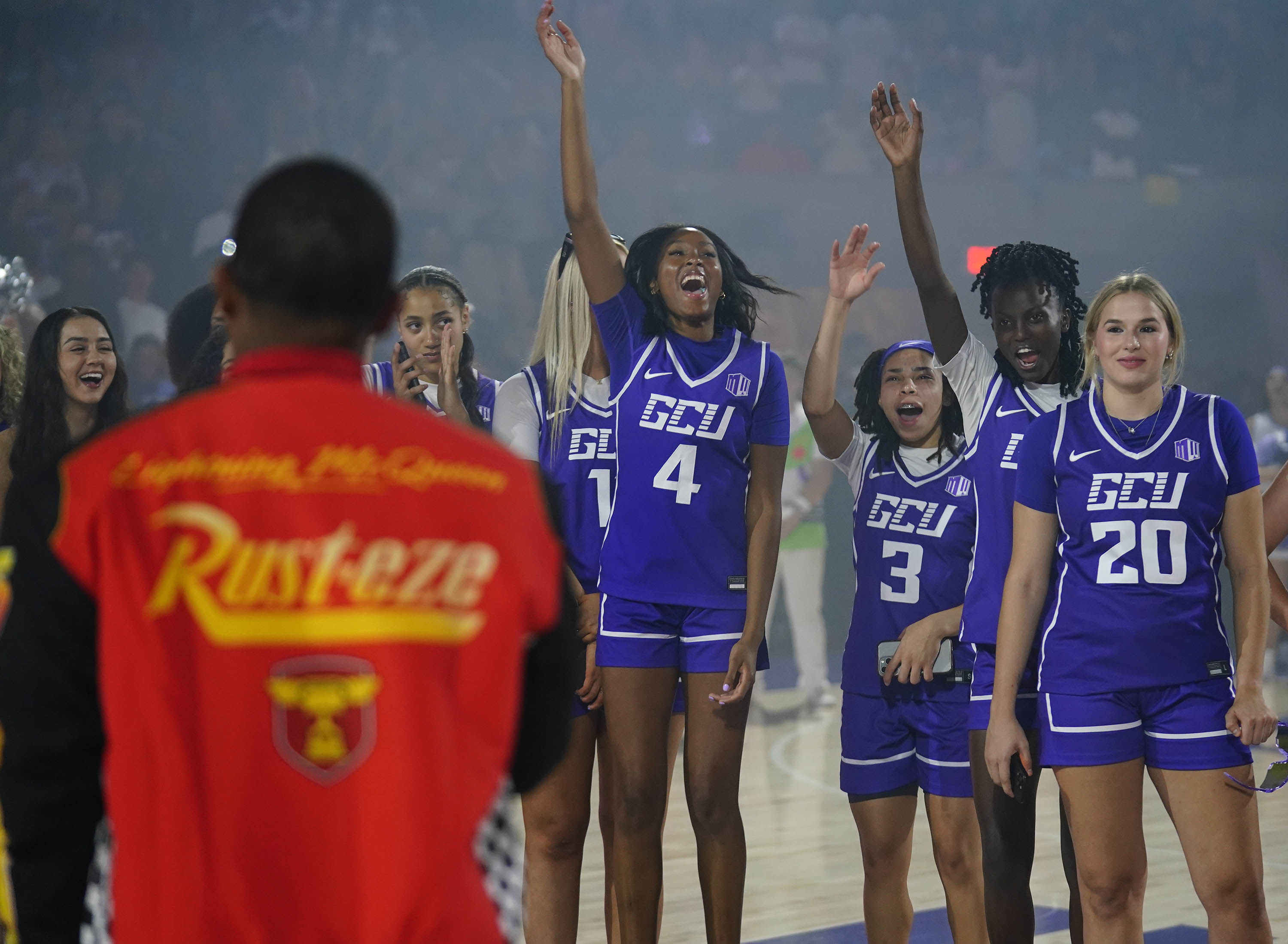 GCU women’s basketball guard Diamond Wright (4) and her teammates acknowledge the crowd during Midnight Madness at Global Credit Union Arena on Oct. 3, 2025 -