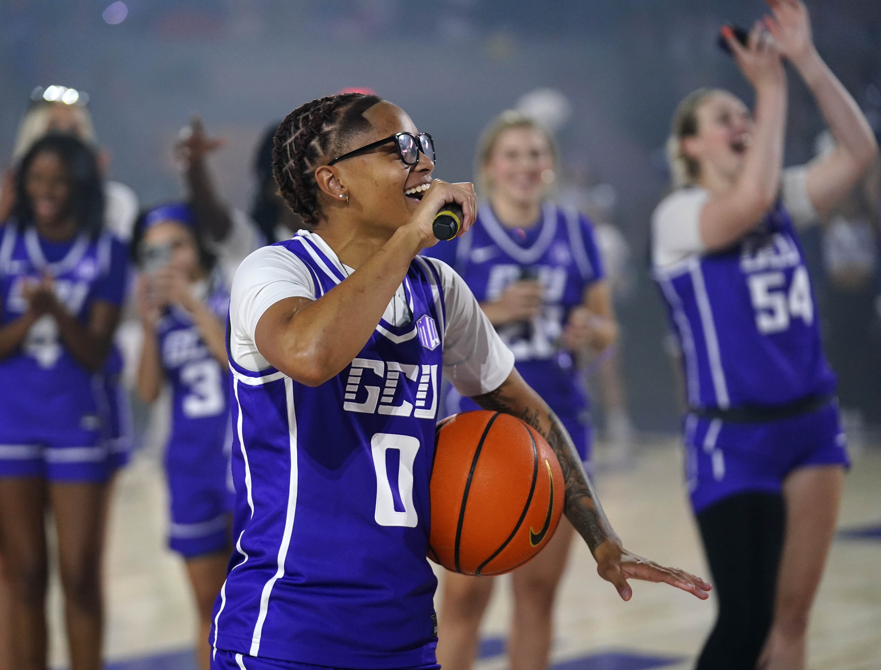GCU women’s basketball guard Chloe Mann pumps up the crowd for the upcoming season during Midnight Madness at Global Credit Union Arena on Oct. 3, 2025 -