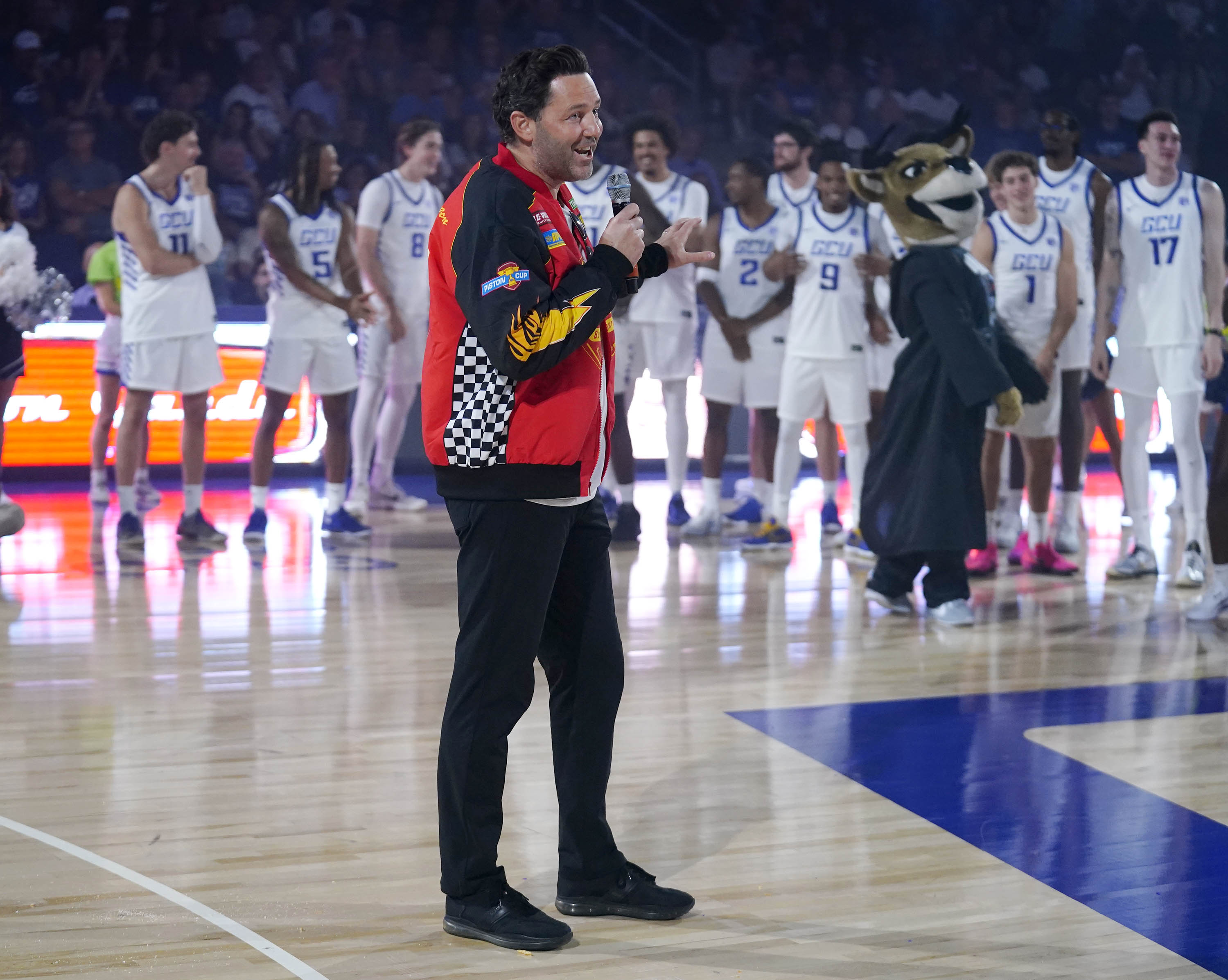 GCU men’s basketball coach Bryce Drew addresses the crowd on the upcoming season during Midnight Madness at Global Credit Union Arena on Oct. 3, 2025 -