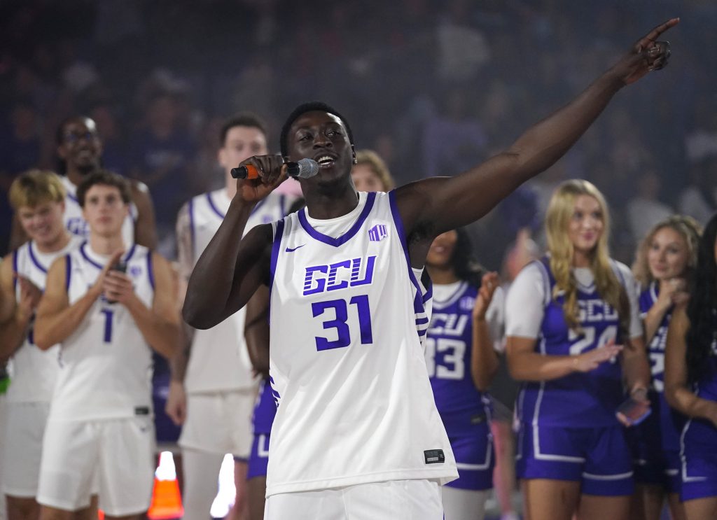 GCU men’s basketball forward Nana Owusu-Anane pumps up the crowd about the upcoming season during Midnight Madness at Global Credit Union Arena on Oct. 3, 2025 -
