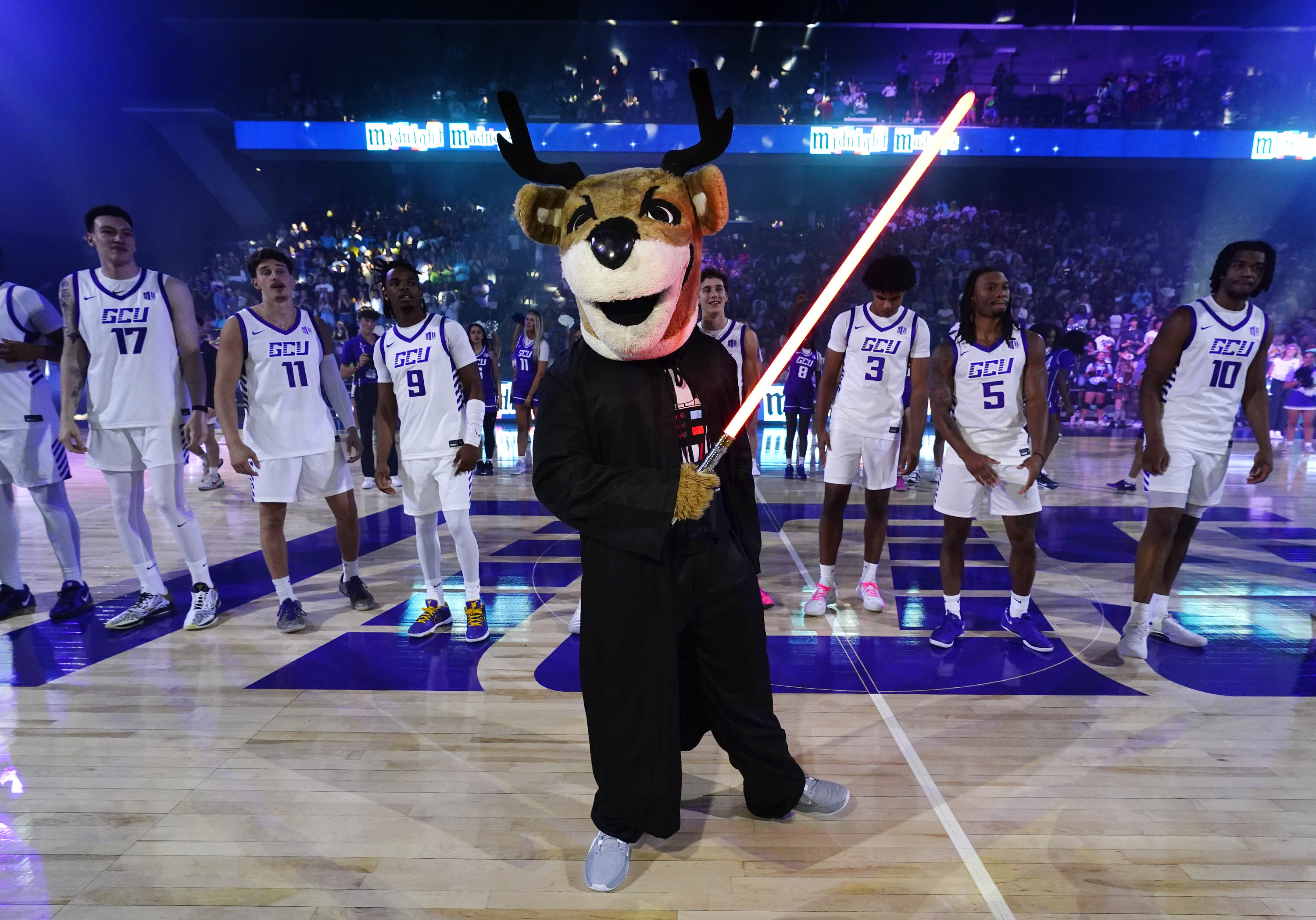 Thunder and the GCU men’s basketball team will be a force to be reckoned with in the Mountain West. Thunder dons a Darth Vader costume and lightsaber during Midnight Madness at Global Credit Union Arena on Oct. 3, 2025