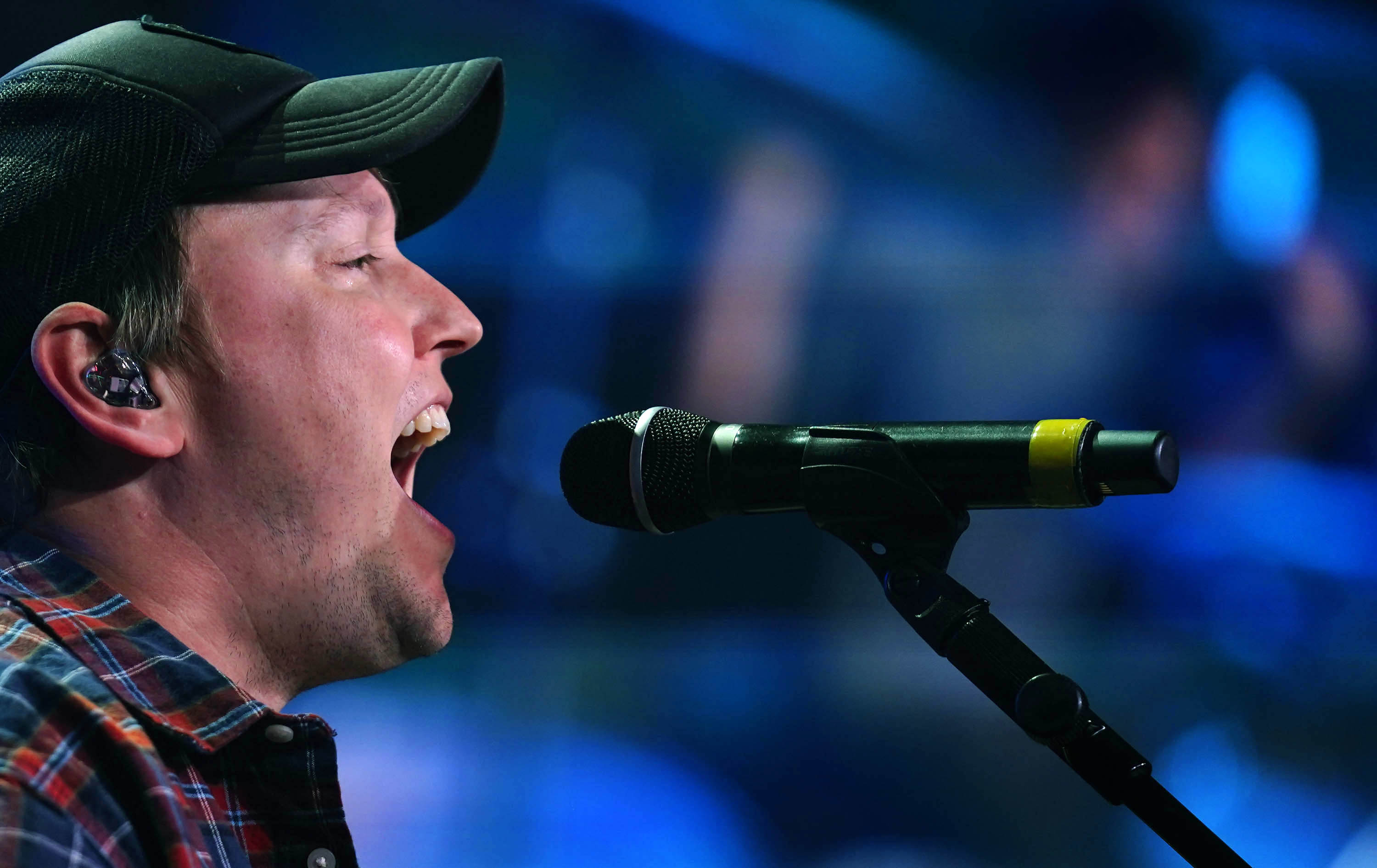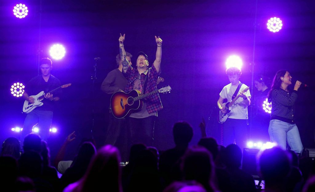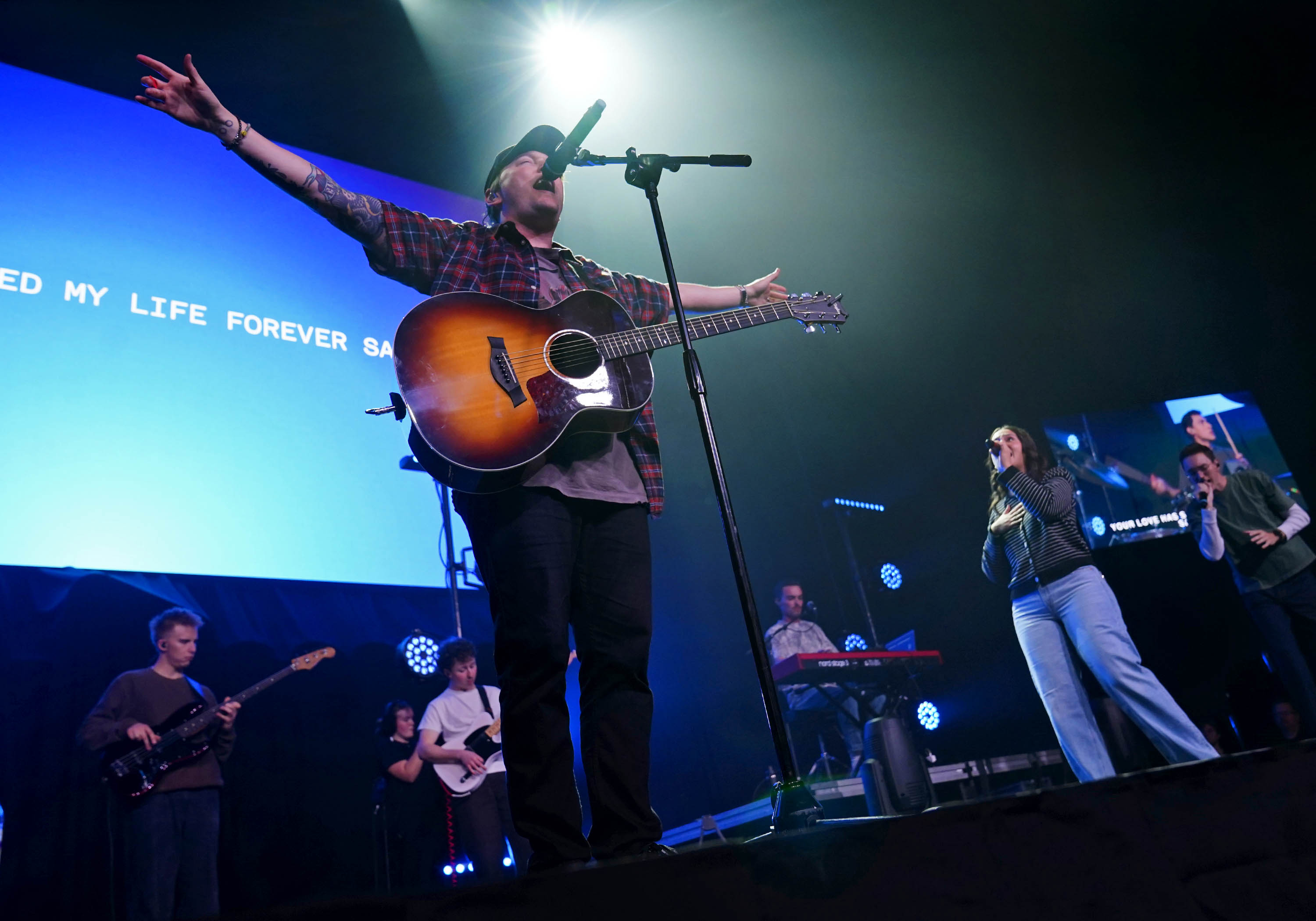 Worship singer/songwriter Mack Brock performs with the Worship team during Monday’s musical Chapel at Global Credit Union Arena on Nov. 10, 2025. -