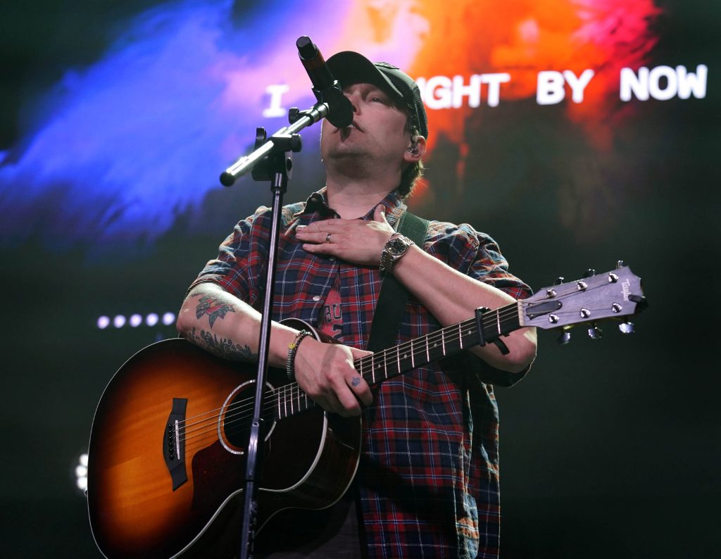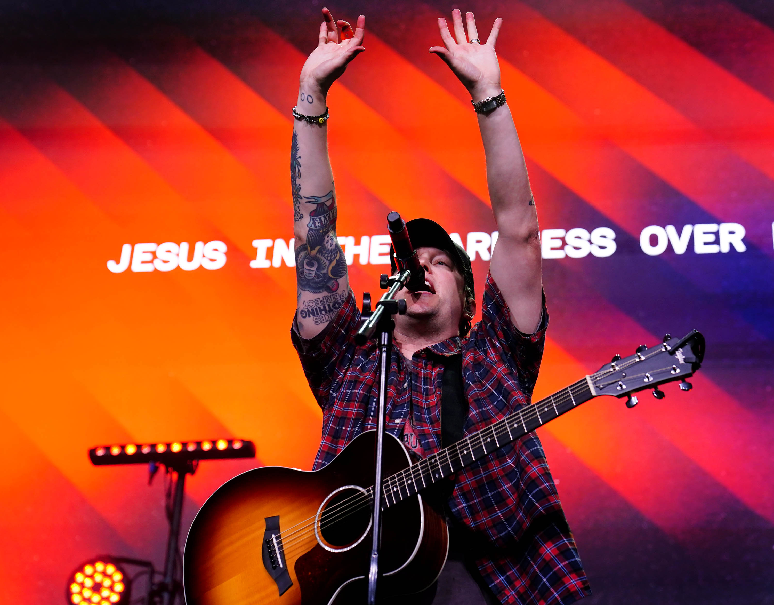 Worship singer-songwriter Mack Brock performs with the Worship team during Monday’s musical Chapel at Global Credit Union Arena on Nov. 10, 2025. -