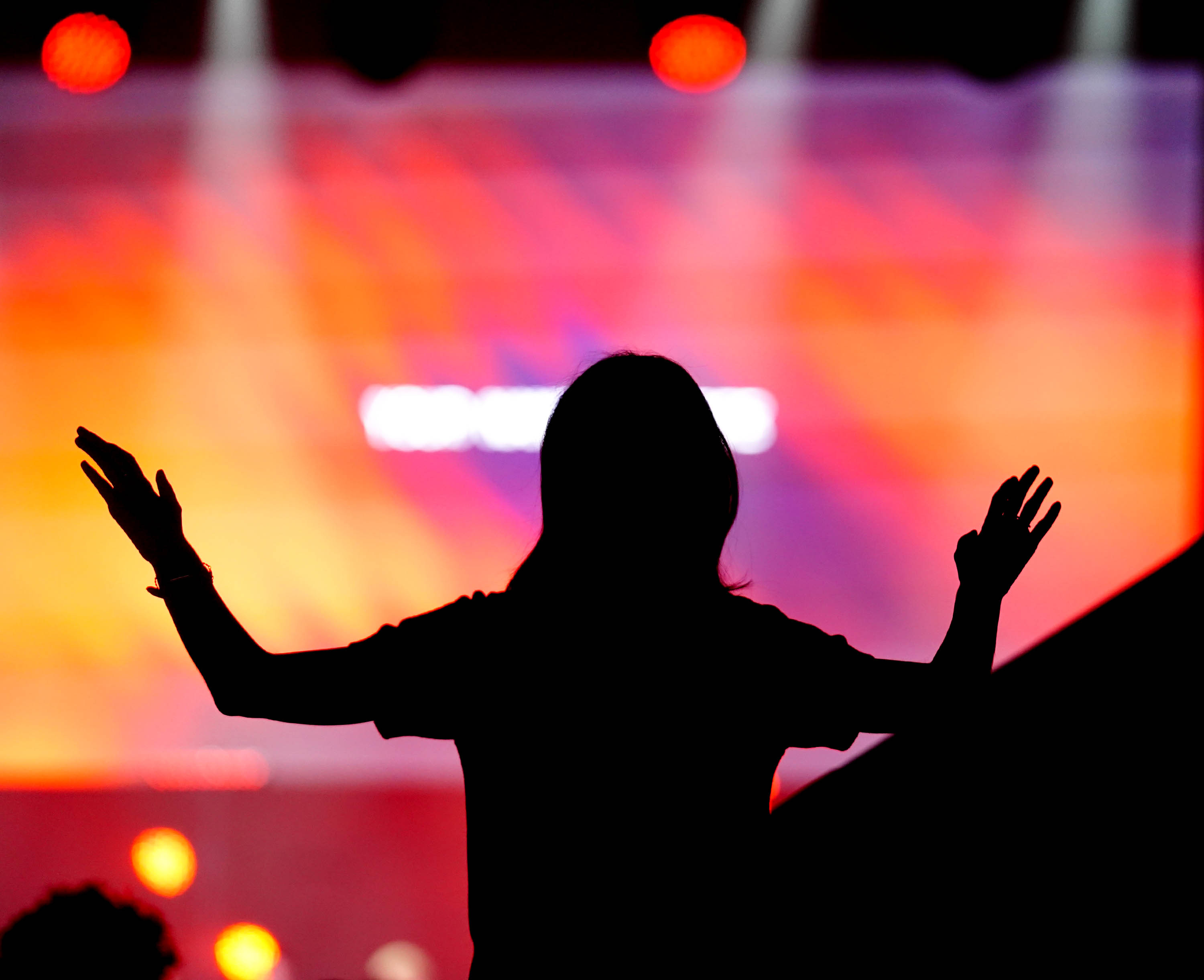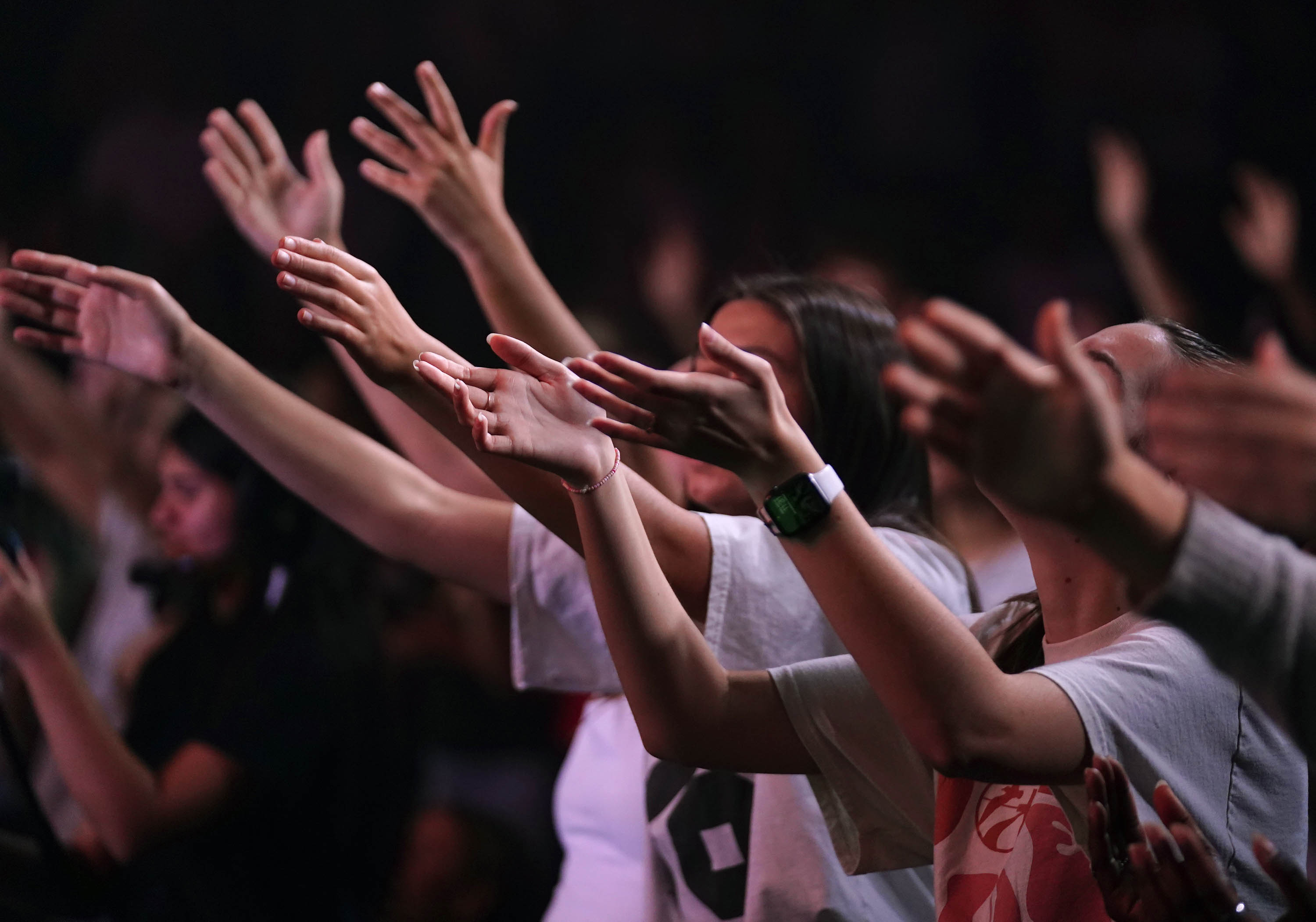Students raise their hands in praise during Monday’s musical Chapel with worship singer-songwriter Mack Brock at Global Credit Union Arena on Nov. 10, 2025. -