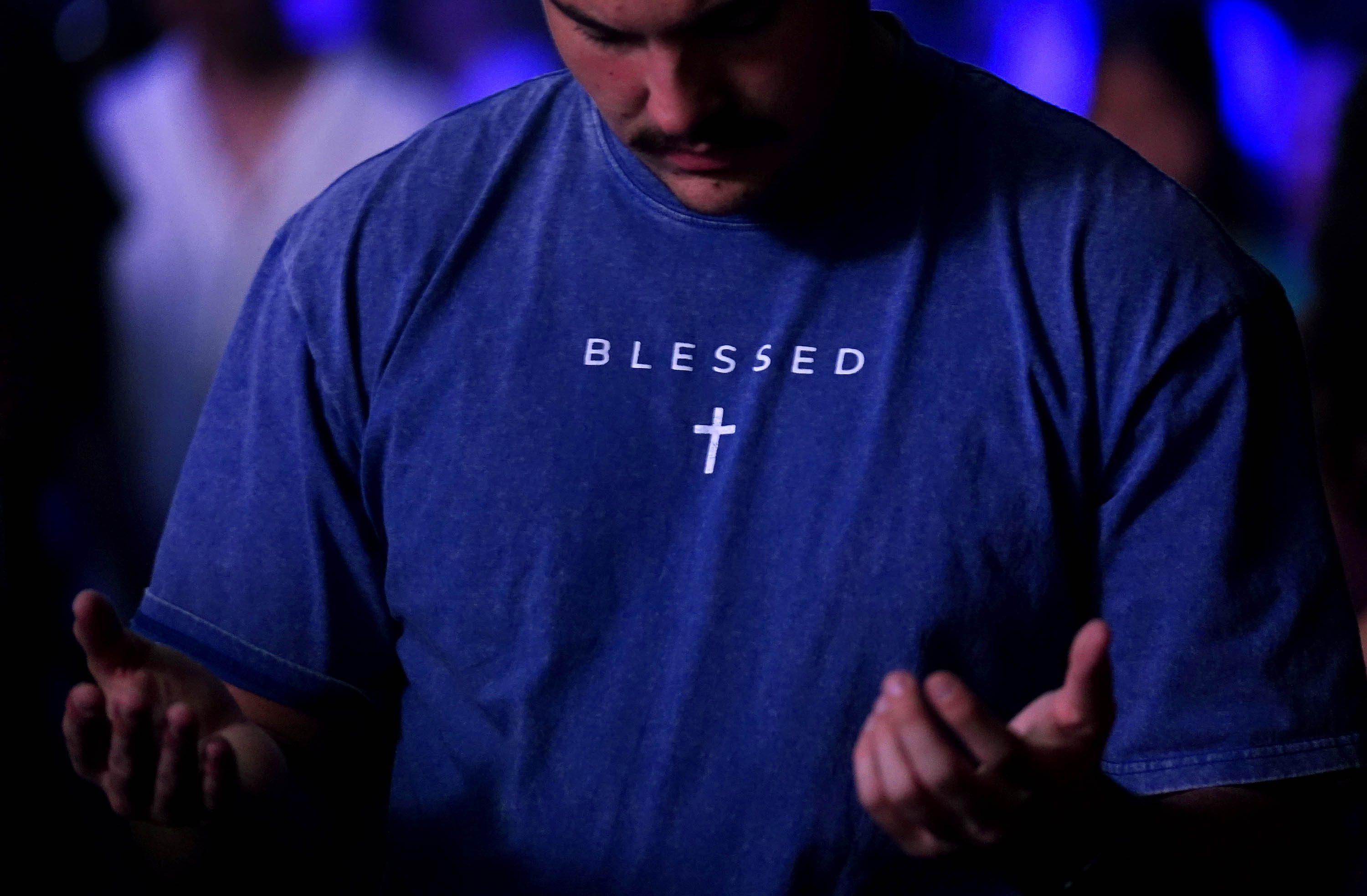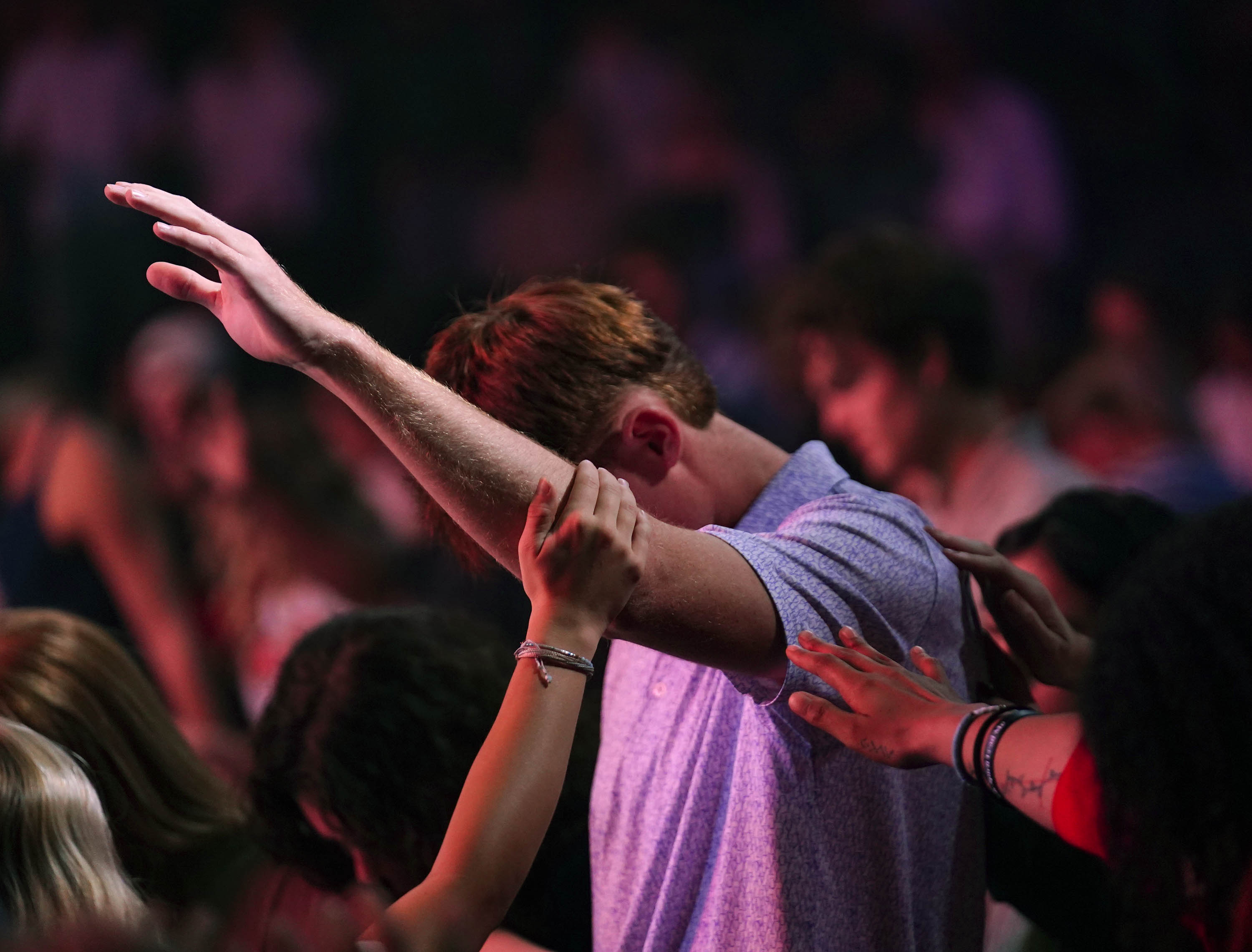 Students reach out in support a fellow student during Monday’s musical Chapel with worship singer-songwriter Mack Brock at Global Credit Union Arena on Nov. 10, 2025.