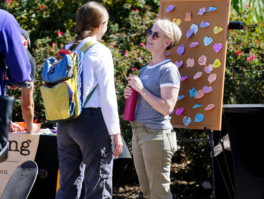 Assistant professor of professional writing Kimbel Westerson talks with a student during an event in observance of National Day on Writing on Oct. 21, 2025. -
