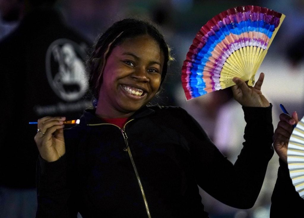 Freshman Markashia Buggs displays her painted fan during the Multicultural Office-sponsored Rhythms of the World in celebration of Culture Week. March 5, 2026. -