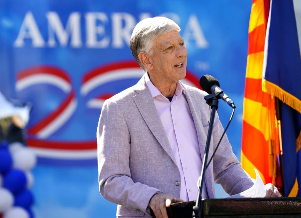 GCU President Brian Mueller welcomes guests to a ceremony celebrating the tour stop of the Arizona America250 Arizona Traveling Museum on campus in front of Global Credit Union Arena on Feb. 27, 2026. -