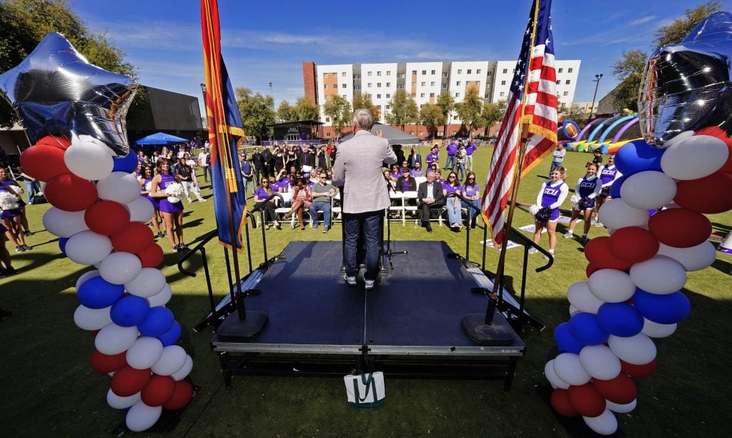 GCU President Brian Mueller welcomes guests to a ceremony celebrating the tour stop of the Arizona Traveling Museum on campus in front of Global Credit Union Arena on Feb. 27, 2026. -