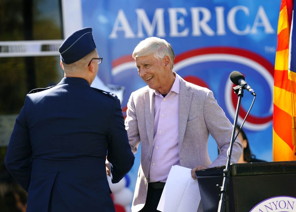 GCU President Brian Mueller welcomes Air Force chaplain Capt. Daniel Starr to give the opening prayer during a ceremony celebrating the tour stop of the Arizona America250 Arizona Traveling Museum on campus in front of Global Credit Union Arena on Feb. 27, 2026. -