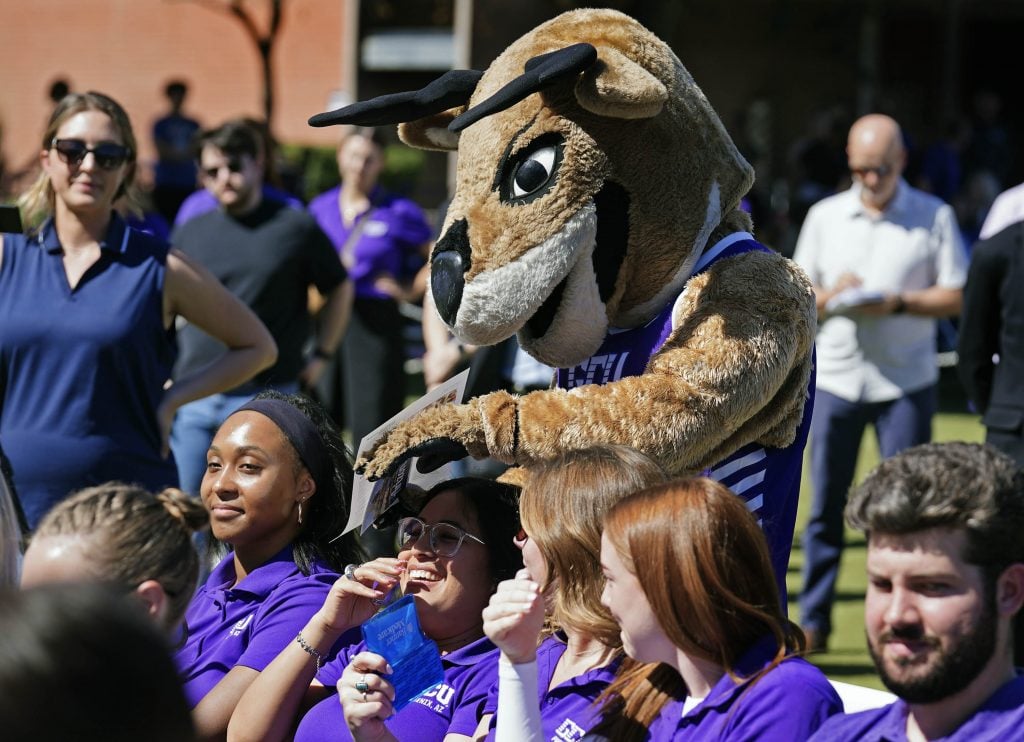 Thunder tests a microphone before a ceremony celebrating the Arizona Traveling Museum tour stop on campus in front of Global Credit Union Arena on Feb. 27, 2026. -