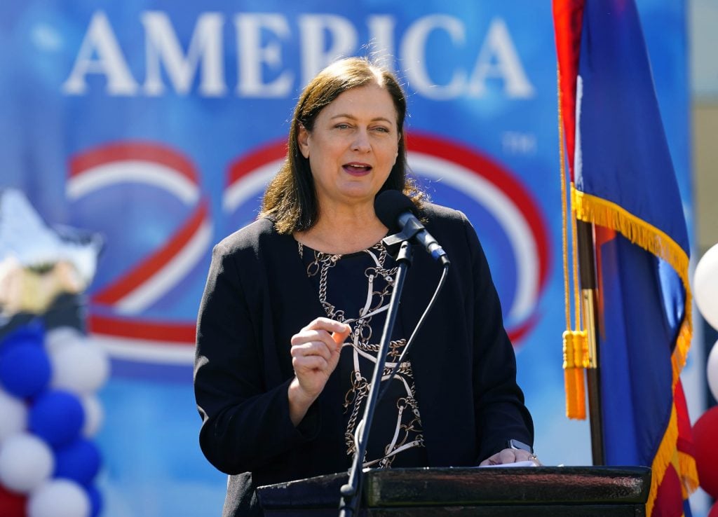Banner Health CEO Amy Perry speaks during a ceremony celebrating the tour stop of the Arizona Traveling Museum on campus in front of Global Credit Union Arena on Feb. 27, 2026. -